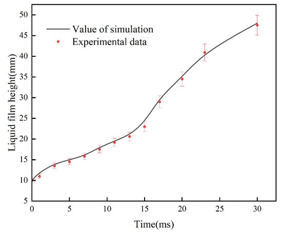 The liquid film lifting time, obtained from the simulation calculations, was compared with the experimental results to validate the model. The error results between the two are shown in Figure 7. The time shown in Figure 7 refers to the liquid film lifting time. The liquid film height refers to the height to which the liquid layer on the spraying plate is lifted. As shown in Figure 7, the simulation results are highly consistent with the experimental results, with small errors, indicating that the previously established model can effectively simulate the gas–liquid flow state. More detailed comparisons between simulation and experimental results regarding droplet dispersion behavior are given in Section 4.2 and Section 4.3.