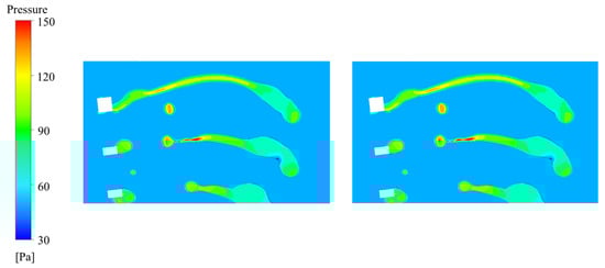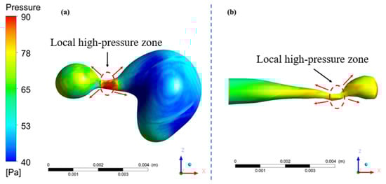 The liquid film forms a liquid column through the spraying pore due to the pressure difference between the inside and outside of the spraying cap. The liquid column forms a liquid neck, due to differences in internal fluid flow, and breaks into drops. Therefore, pressure changes around the liquid column are crucial to the formation of the liquid neck. The simulation results are shown in the Figure 12.