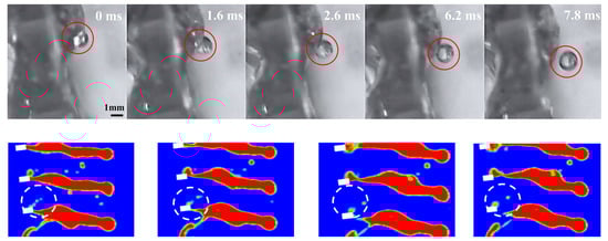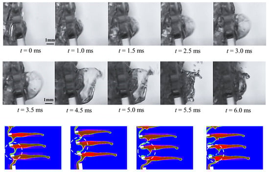 When F0 is large, liquid film breakage occurs in the CTST, as shown in Figure 11. At first, the highest point of the liquid film pressure breaks, triggering a series of liquid film breakages, which ultimately form many small individual daughter drops; this phenomenon is more pronounced in the simulation figures/plots. Some of these daughter drops move with the upward gas flow, some return to the spraying plate, and some of the liquid film that did not form drops also returns to the spraying plate to participate in the next gas–liquid dispersion process.