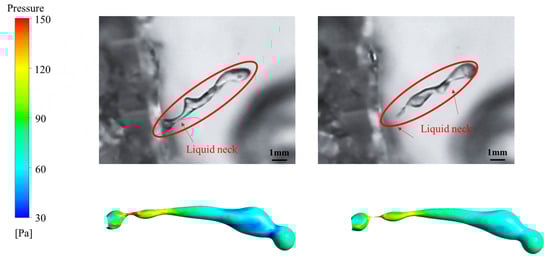 The present study supposes it is the Kelvin–Helmholtz (K-H) instability [38] that leads to the deformation and fracture of liquid columns. K-H instability occurs on the interfaces of two different fluids with a velocity difference. It is well known that velocity differences lead to pressure differences. That is, due to the different velocity distributions inside and outside the CTST cap, K-H instability causes the liquid column to bend the interface, which results in a pressure difference, which is the Laplace pressure at the surface of the liquid column [39,40]. Figure 9 compares two liquid columns in which one liquid neck is near the tail, while the other is near the head.