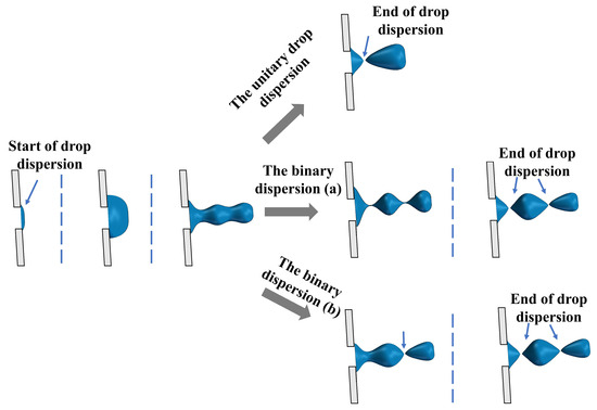 In addition to the drop dispersion mode, another important issue regarding drop dispersion is the dispersion time [41]. Solsvik et al. [37] defined the drop dispersion time as the duration from the initial deformation of a spherical drop to the generation of the last daughter drop. This definition is further adopted by Herø et al. [42] and Karimi and Andersson [43]. In this study, since the spacing between the arrayed pores is 1 mm, in order to eliminate the influence of drop dispersion between adjacent rows, the dispersion time is defined as the moment when the drops start to disperse, just as the liquid column emerges from the arrayed pores. The typical dispersion process of the drops passing through the arrayed pores is shown in Figure 14. For the drop dispersion in CTSTs, it ends when the last daughter drop is generated.