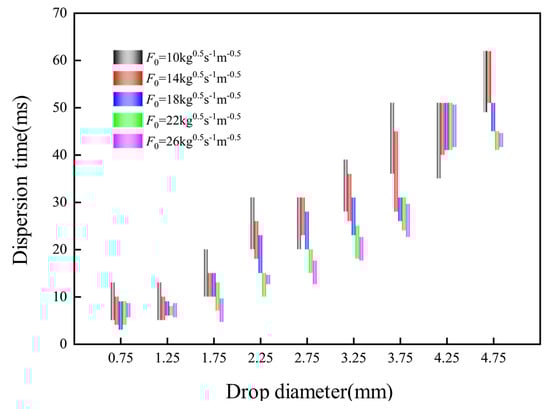 It is noted that, when the drop diameter exceeds about 4.5 mm, there is a slight decrease in the drop dispersion time. This finding is consistent with the results reported in previous studies [44]. The primary reason for this phenomenon is that, when the drop size is small, the main forces determining the drop dispersion are the fs and the fc. However, when the drops produced are too large, on the one hand, the larger drops are subjected to a greater degree of stretching or deformation; on the other hand, the larger the drop size, the more the drop is subjected to the effect of gravity. Both lead to Rayleigh–Taylor (R-T) instability [45], which has an important effect on the drop dispersion behavior, thus shortening the drop dispersion time.