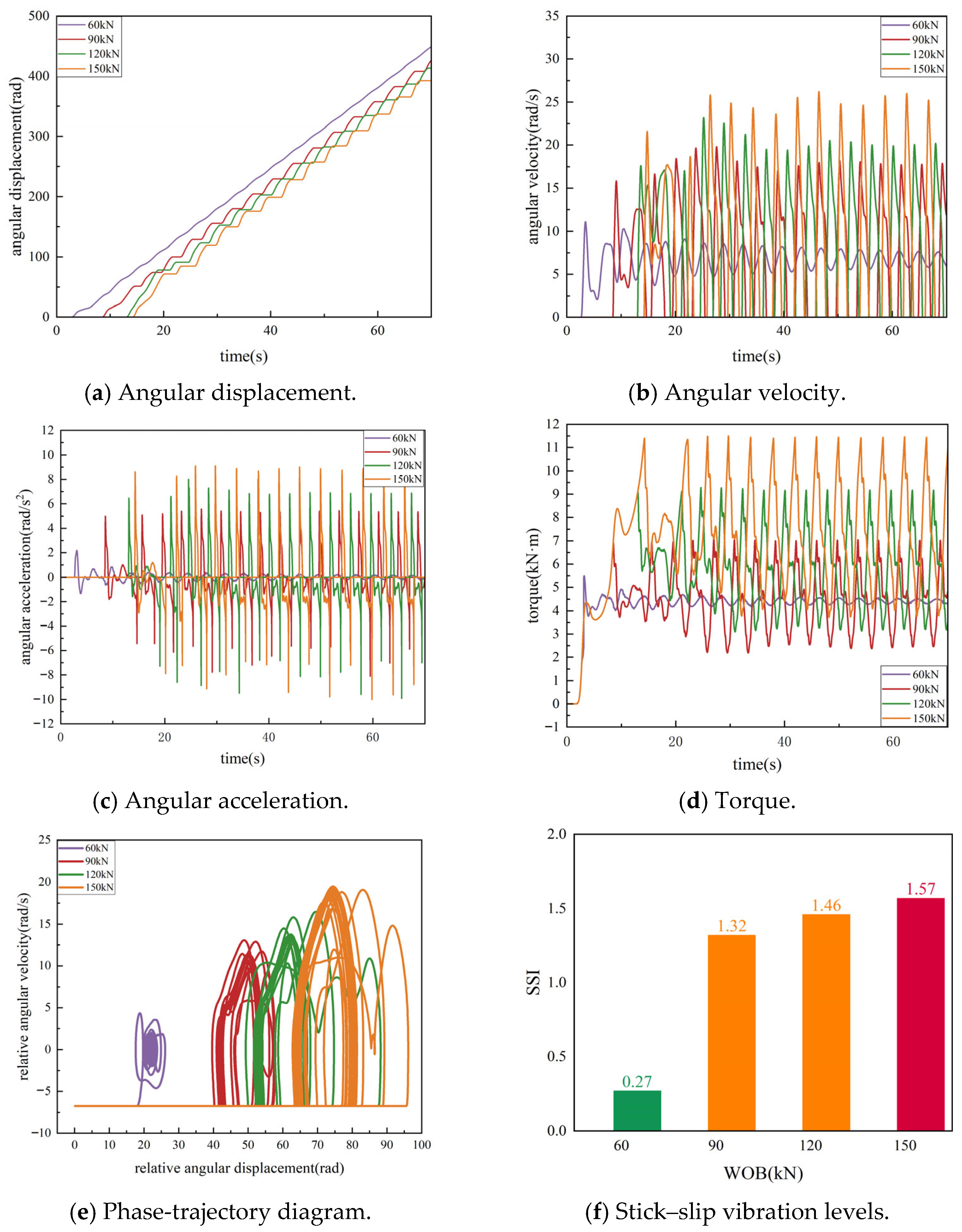 - For the case of horizontal well analyzed in this study, the WOB mainly affects stick–slip through the bit–rock interaction. The simulation results show that when WOB is reduced to about 60 kN, the torsional stick–slip vibration at the bit can be effectively eliminated and the SSI approaches zero, indicating that lowering the WOB is an efficient way to suppress stick–slip in this operating condition. However, such a low WOB also reduces the depth of cut and mechanical rate of penetration, implying that, in field practice, a compromise must be made between stick–slip mitigation and drilling efficiency when selecting the WOB.