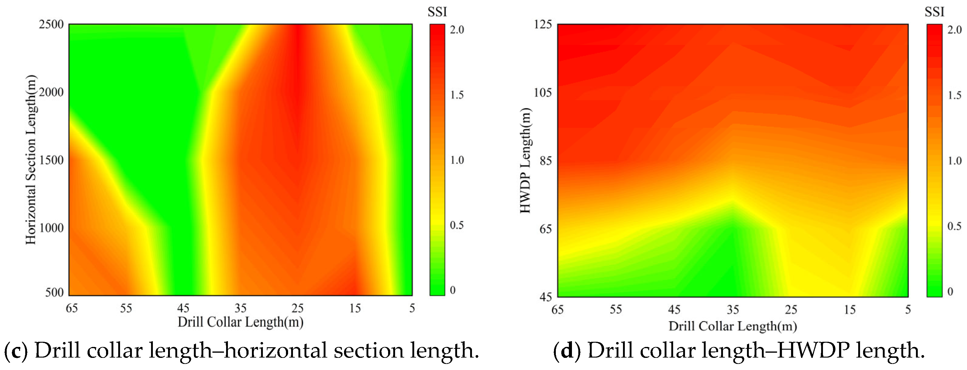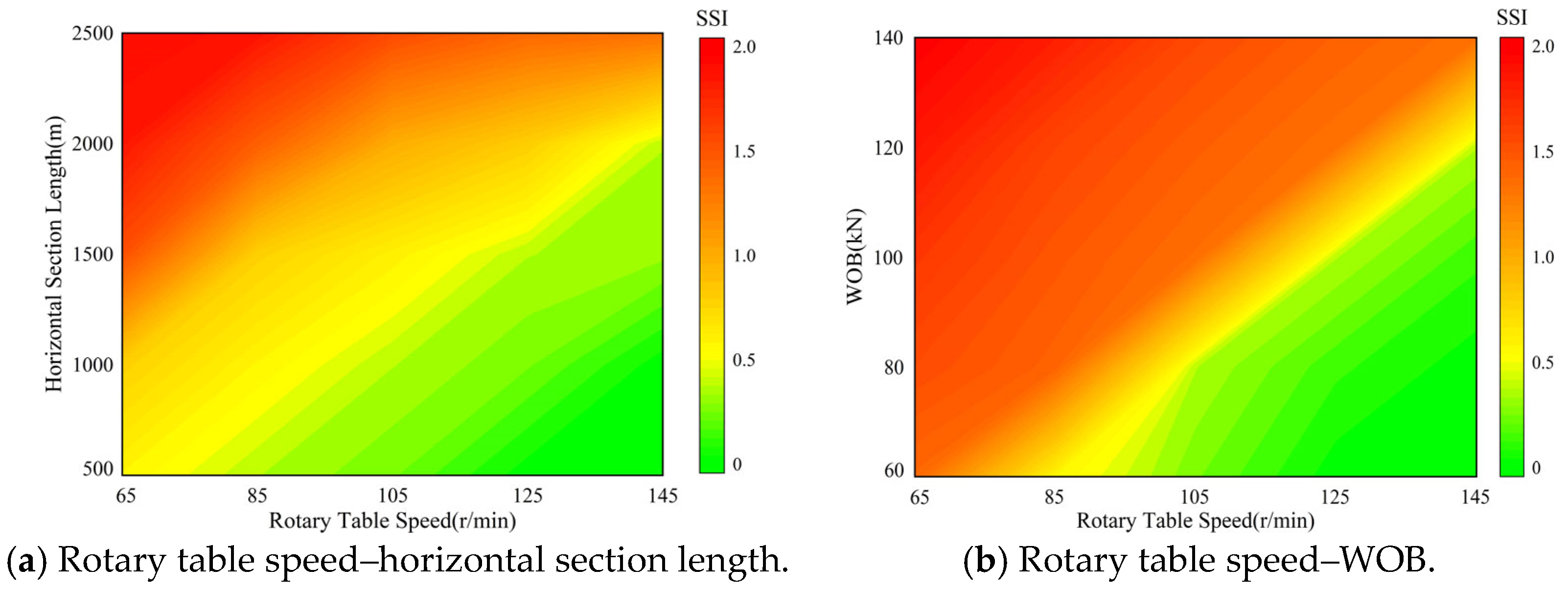 - BHA configuration, particularly drill collar and HWDP lengths, significantly affects the distribution of torsional stiffness and inertia along the string. Appropriately increasing the drill collar and HWDP length improves the rigidity of the lower BHA, smooths the bit rotational response, and reduces SSI, whereas unreasonable configurations may intensify torsional transients. By combining the SSI with the proposed model, stick–slip severity maps are constructed for different combinations of rotary speed, WOB, BHA parameters, and horizontal section length, providing a simple and practical tool for parameter and BHA optimization in horizontal wells.