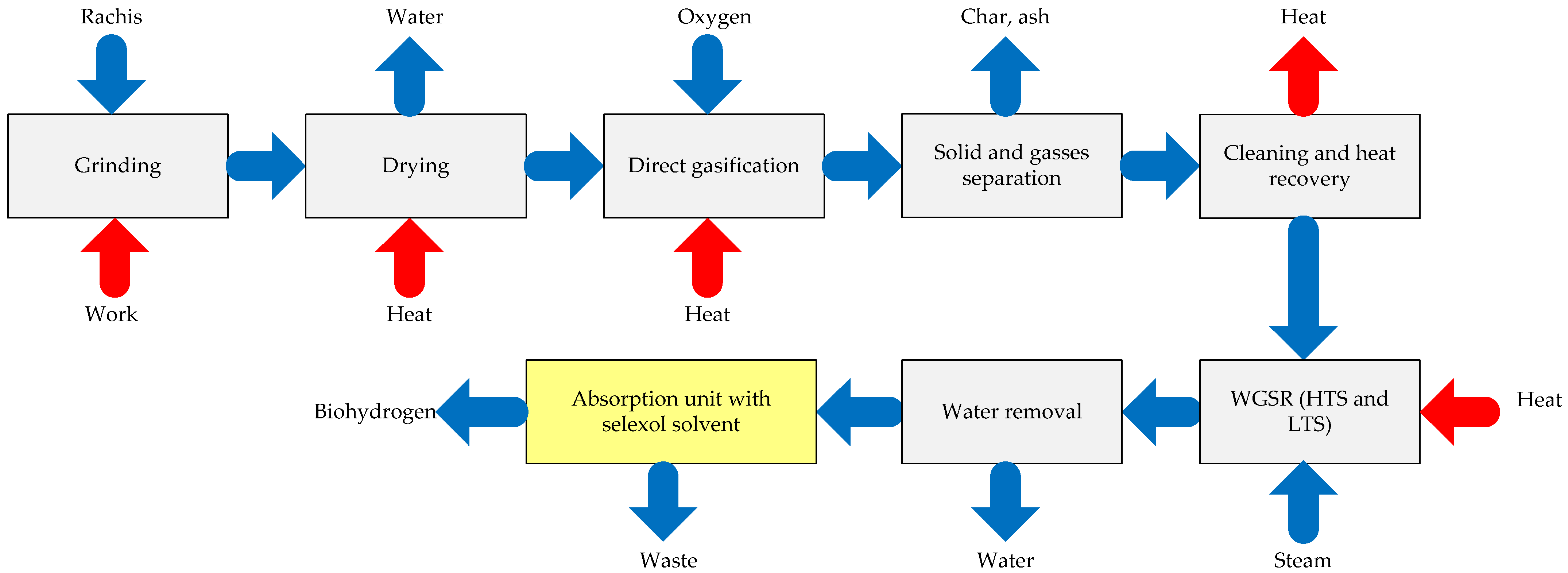- Vargas-Mira, A.; Zuluaga-García, C.; González-Delgado, Á.D. A Technical and Environmental Evaluation of Six Routes for Industrial Hydrogen Production from Empty Palm Fruit Bunches. ACS Omega 2019, 4, 15457–15470. [Google Scholar] [CrossRef] [PubMed]