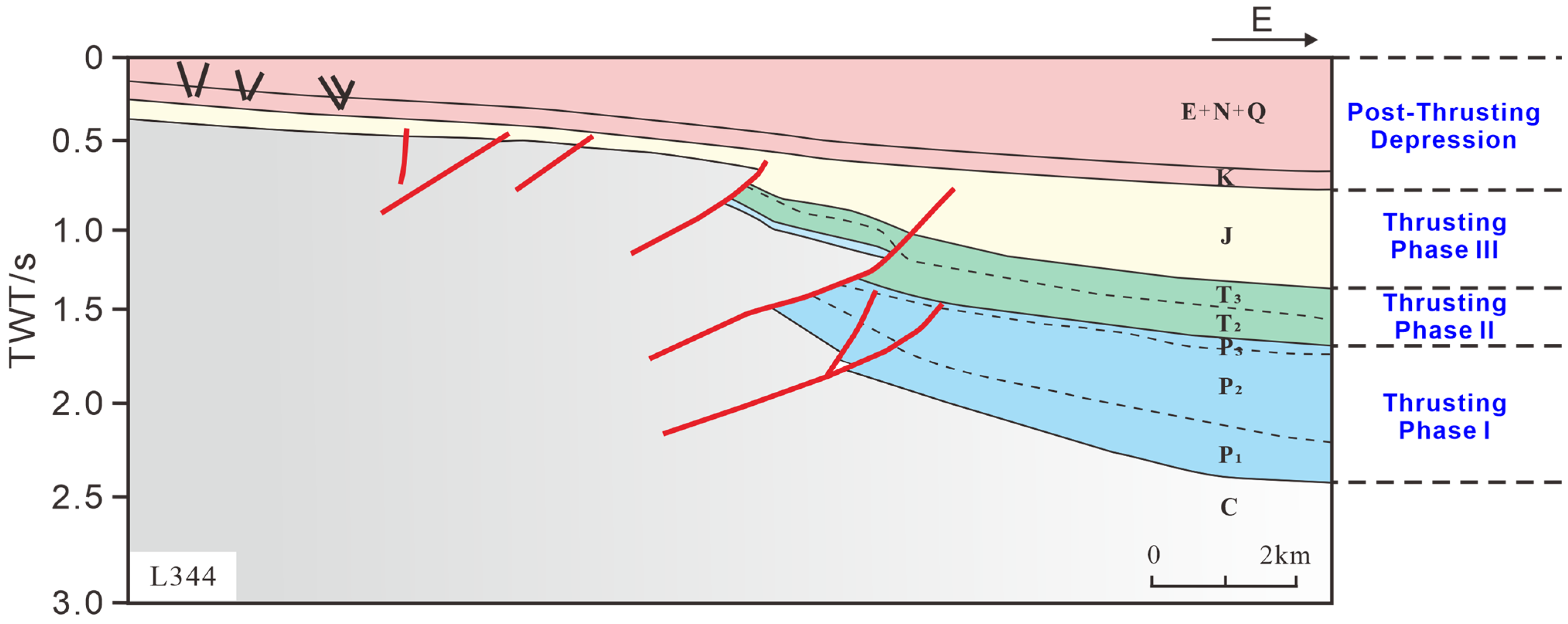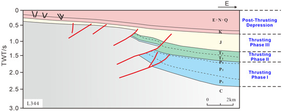- Yang, H.; Hu, S.; Yang, X.; Hu, M.; Xie, H.; Zhang, L.; Li, L.; Zhou, L.; Zhang, G.; Luo, H.; et al. Episodic Thrusting and Sequence-Sedimentary Responses and Their Petroleum Geological Significance in Kuga Foreland Basin, NW China. Pet. Explor. Dev. 2024, 51, 1254–1266. [Google Scholar] [CrossRef]