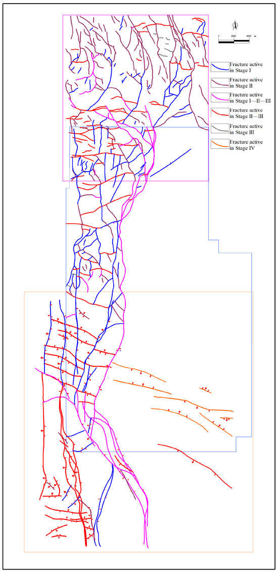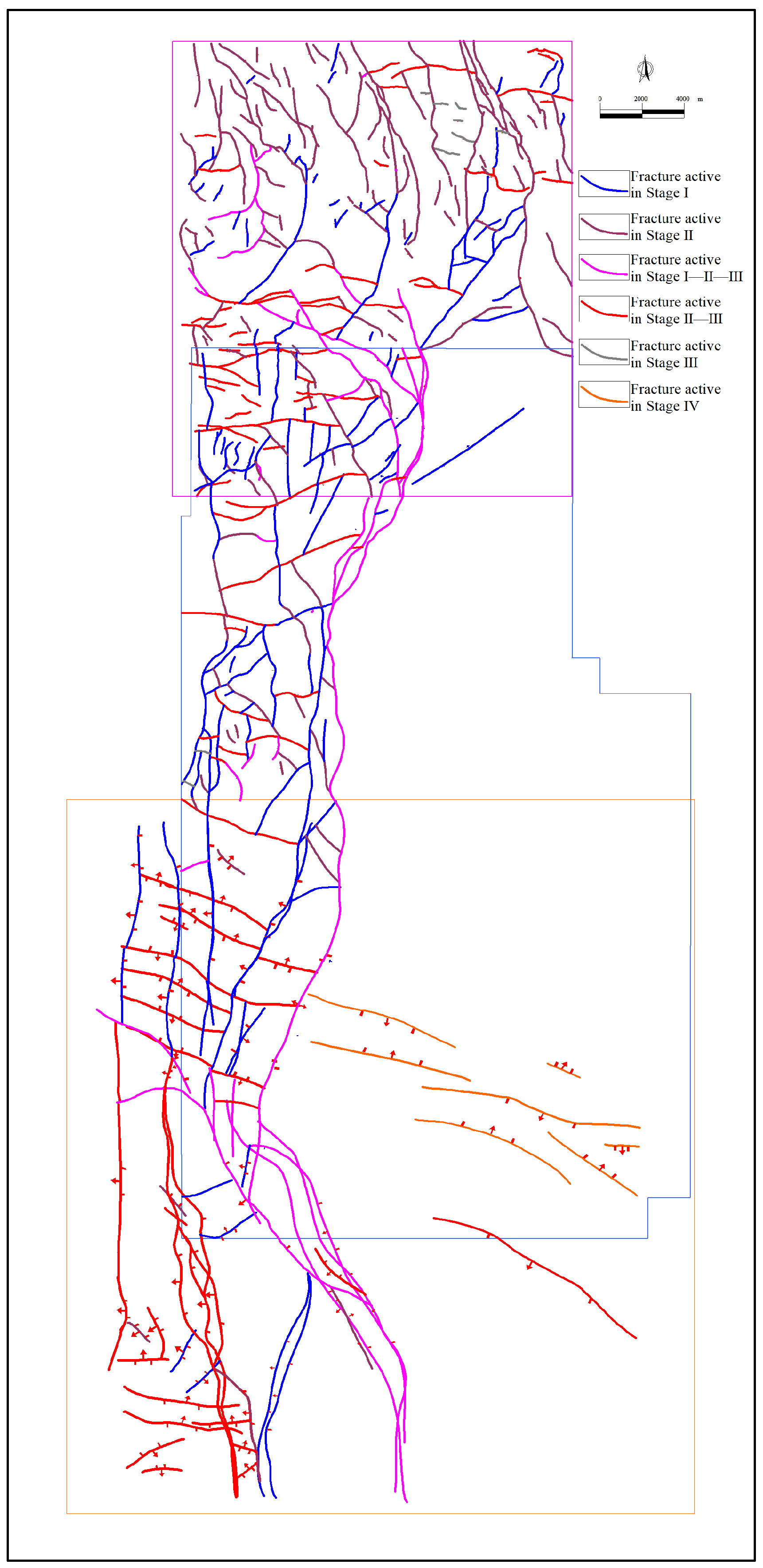 - The fault system in the study area is characterized by multi-stage and multi-trend composite development. The NNE-trending faults were mainly formed in Stage I, controlled by the NWW-directed compressive stress. Most of them only showed activity in Stage I or continued to be active until Stage III. The NNW-trending faults mainly started to be active in Stage II or were active from Stage I to Stage III, reflecting the transformation of the tectonic stress field in the Late Triassic.