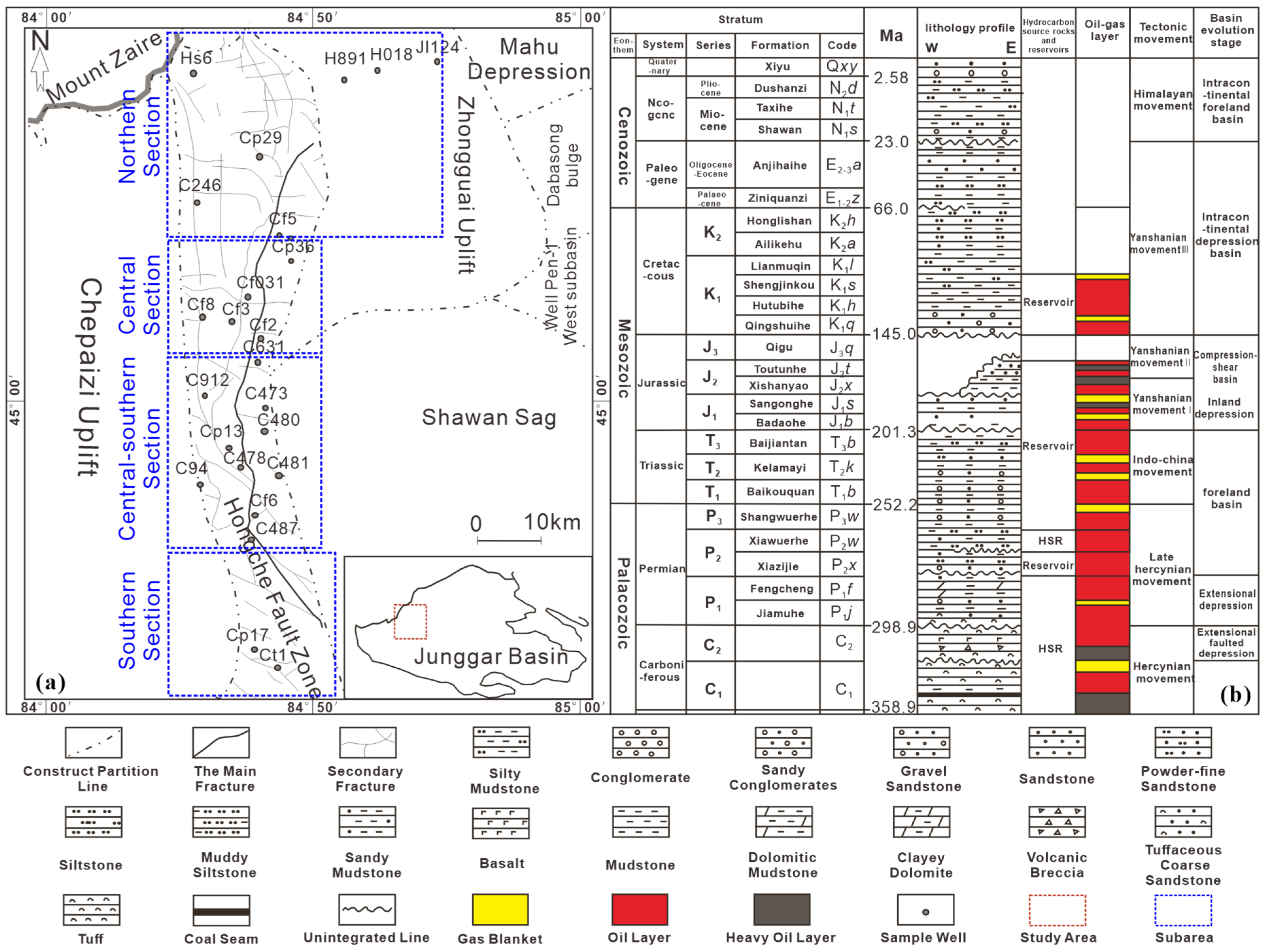 - Ji, J.; Wu, K.; Liu, Y.; Pei, Y.; Li, T. Cementing and Sealing Actions of Hongche Fault Belt in Zhongguai Area of Northwest Margin of Junggar Basin. Pet. Geol. Oilfield Dev. Daqing 2019, 38, 17–25. [Google Scholar] [CrossRef]