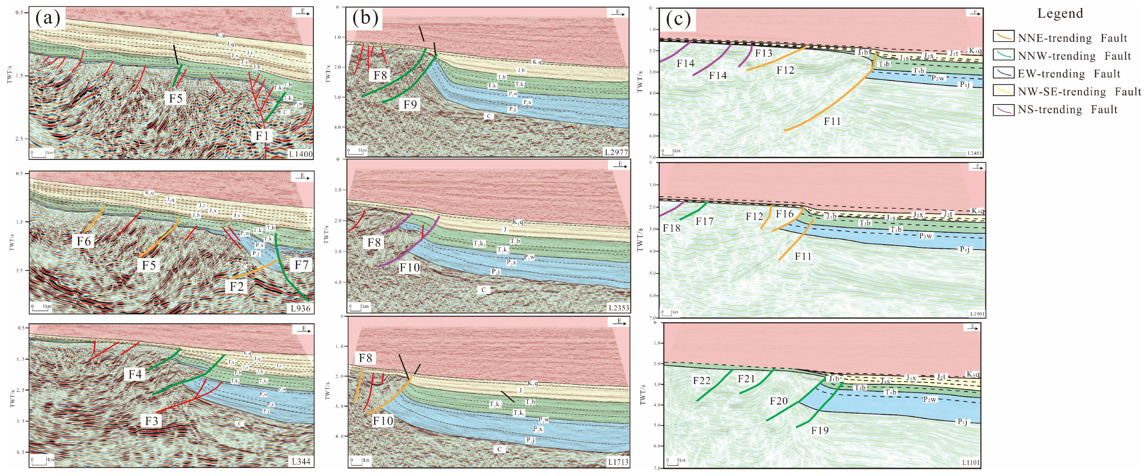 - Yang, Y.; Yang, C.; Sun, J.; Liang, J.; Zhao, Q.; Wang, J. Fault Characteristics and Reservoir Potential of Mesozoic Basins in the Southern East China Sea. J. Mar. Sci. Eng. 2024, 12, 1800. [Google Scholar] [CrossRef]