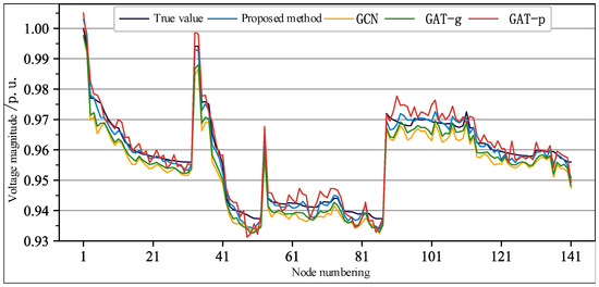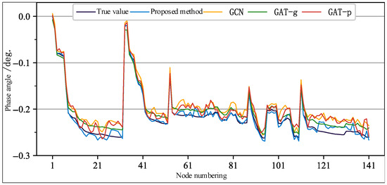 To verify the effectiveness of the proposed method, comparative experiments were conducted against representative benchmarks and ablation variants. The comparison includes a GCN-based state estimation method, a GAT-based method trained without the proposed GMM-based data augmentation using only the original dataset (denoted as GAT-g), and a GAT-based variant excluding both the topological feature and operational constraint embedding modules (denoted as GAT-p). The quantitative performance comparison of all four approaches is presented in Table 3.