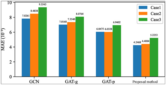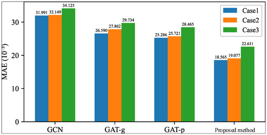 To evaluate the capability of the proposed method in handling real-time measurement loss, three test cases were designed. In Case 1, real-time measurements at nodes 13 and 21 were removed; in Case 2, measurements at nodes 61 and 65 were omitted; and in Case 3, measurements at nodes 13, 21, 61, and 65 were simultaneously missing. The estimation results for the missing-measurement scenarios are illustrated in Figure 5 and Figure 6. Taking Case 3 as an example, compared with the complete-measurement scenario, the MAE of voltage magnitude and phase angle in the proposed method increased by and , respectively, representing smaller increments than those observed for the second-best method, GAT-p, whose increases were and . This superior performance can be attributed to the incorporation of the grid admittance matrix within the proposed framework and the inclusion of an operational constraint regularization term in the loss function to guide the model training process. These enhancements effectively embed physical prior knowledge into the learning model, enabling it to maintain high estimation accuracy even when partial measurement data are unavailable.