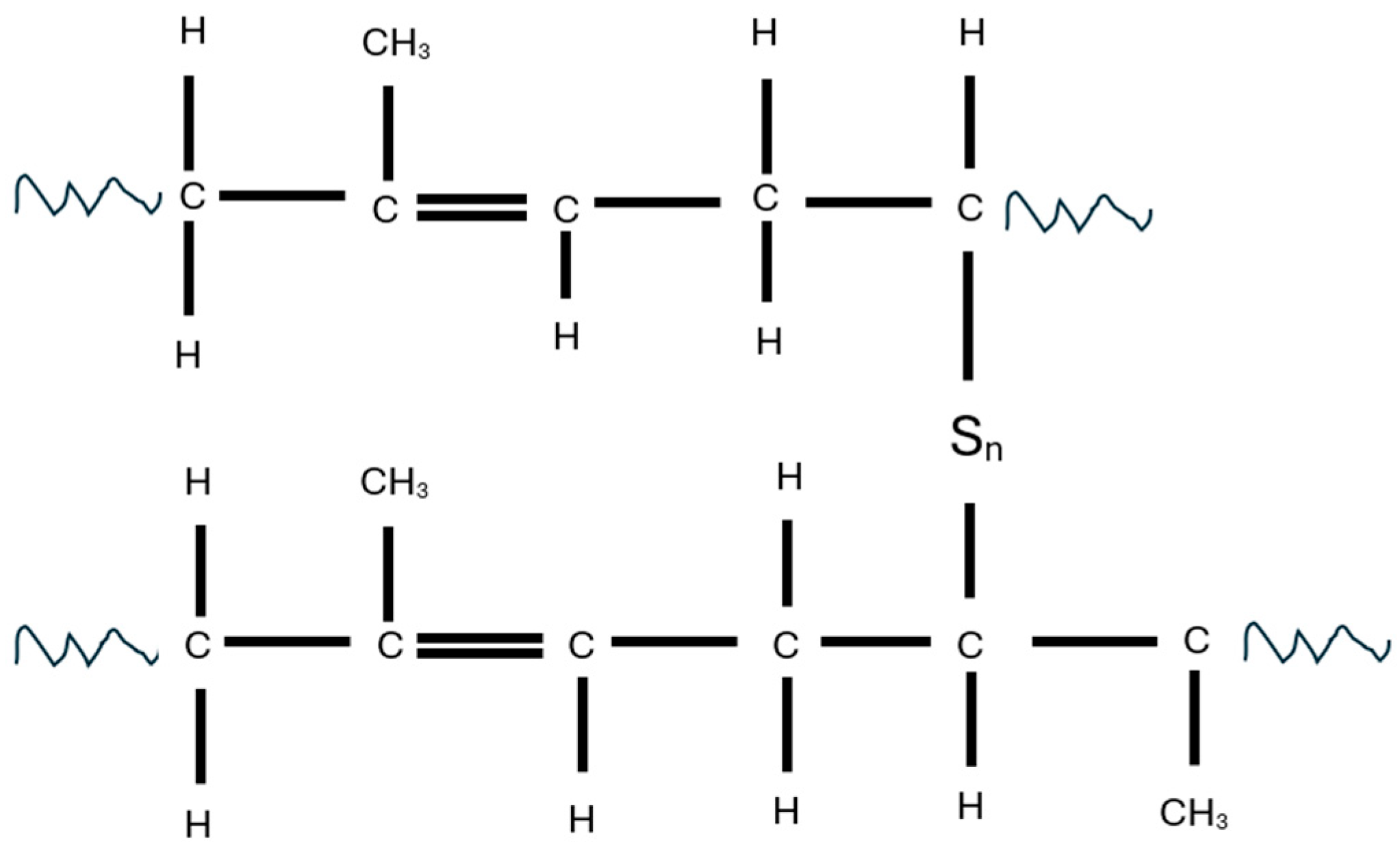 - Cataldo, F. Thermochemistry of Sulfur-Based Vulcanization and of Devulcanized and Recycled Natural Rubber Compounds. Int. J. Mol. Sci. 2023, 24, 32623. [Google Scholar] [CrossRef]