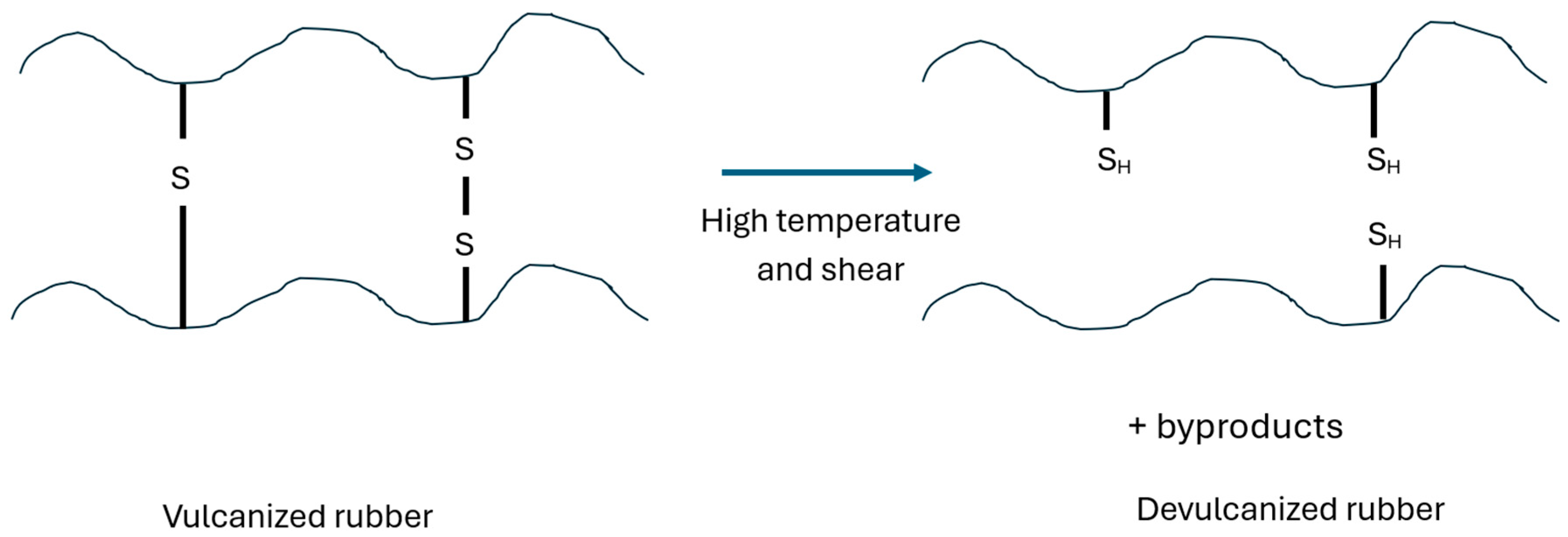 | Devulcanization | Breaking the sulfur crosslinks in vulcanized rubber | Process using heat, chemical agents, and mechanical shears to produce devulcanized rubber, which retains its natural properties of rubber | Process may break the main C-C polymer in addition to breaking the sulfur crosslinks, which will weaken the mechanical properties of devulcanized rubber | [9,10] |