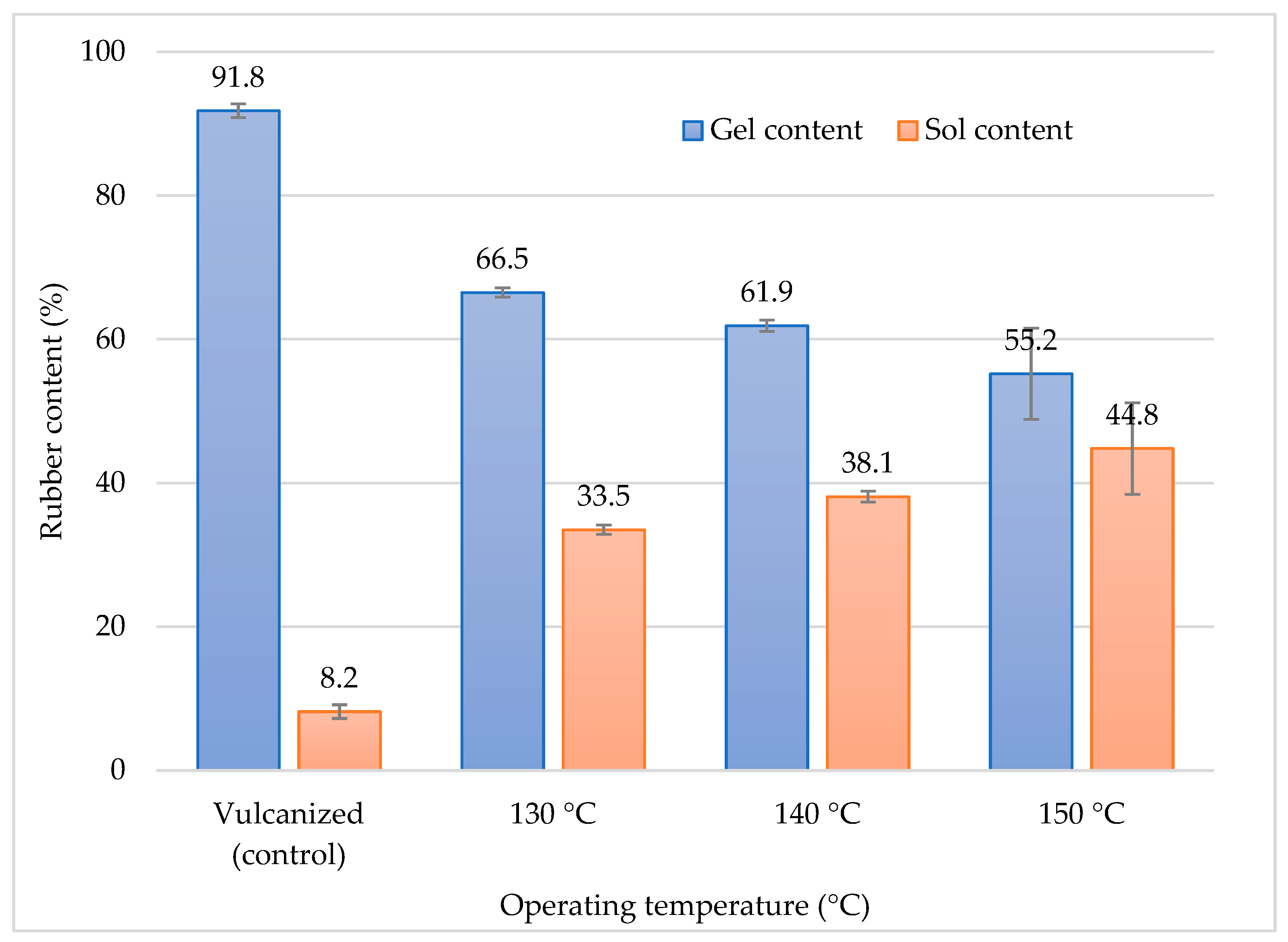 - Gschwind, L.; Jordan, C.S.; Vennemann, N. Devulcanization of ethylene-propylene-diene monomer rubber waste. Effect of diphenyl disulfide derivate as devulcanizing agent on vulcanization, and devulcanization process. J. Appl. Polym. Sci. 2022, 139, 52141. [Google Scholar] [CrossRef]