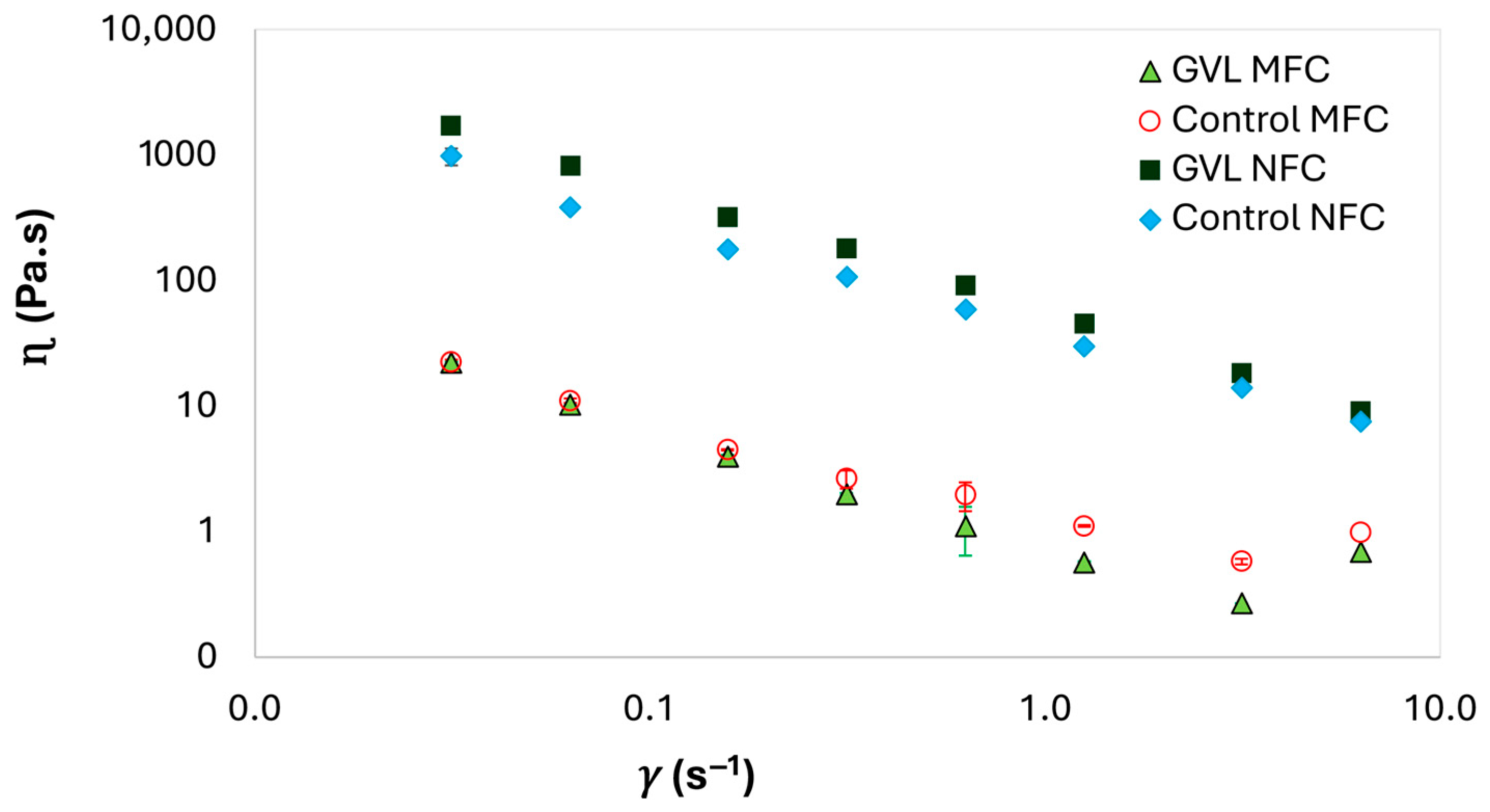 3.2. Purely Mechanical Fibrillation of GVL Pulps for MFC Production