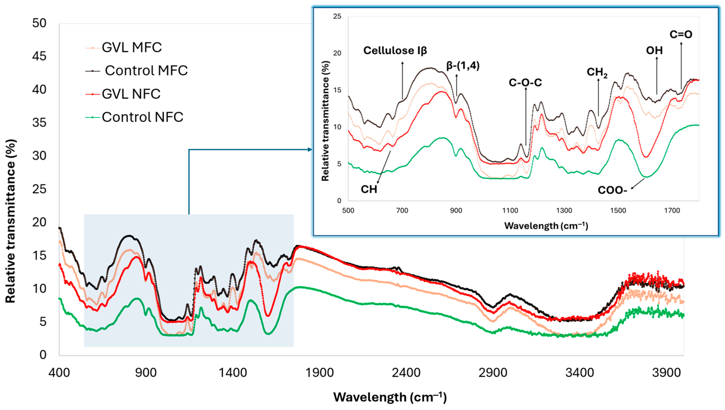 3.4. DP, Crystallinity, and FTIR for MFC and NFC