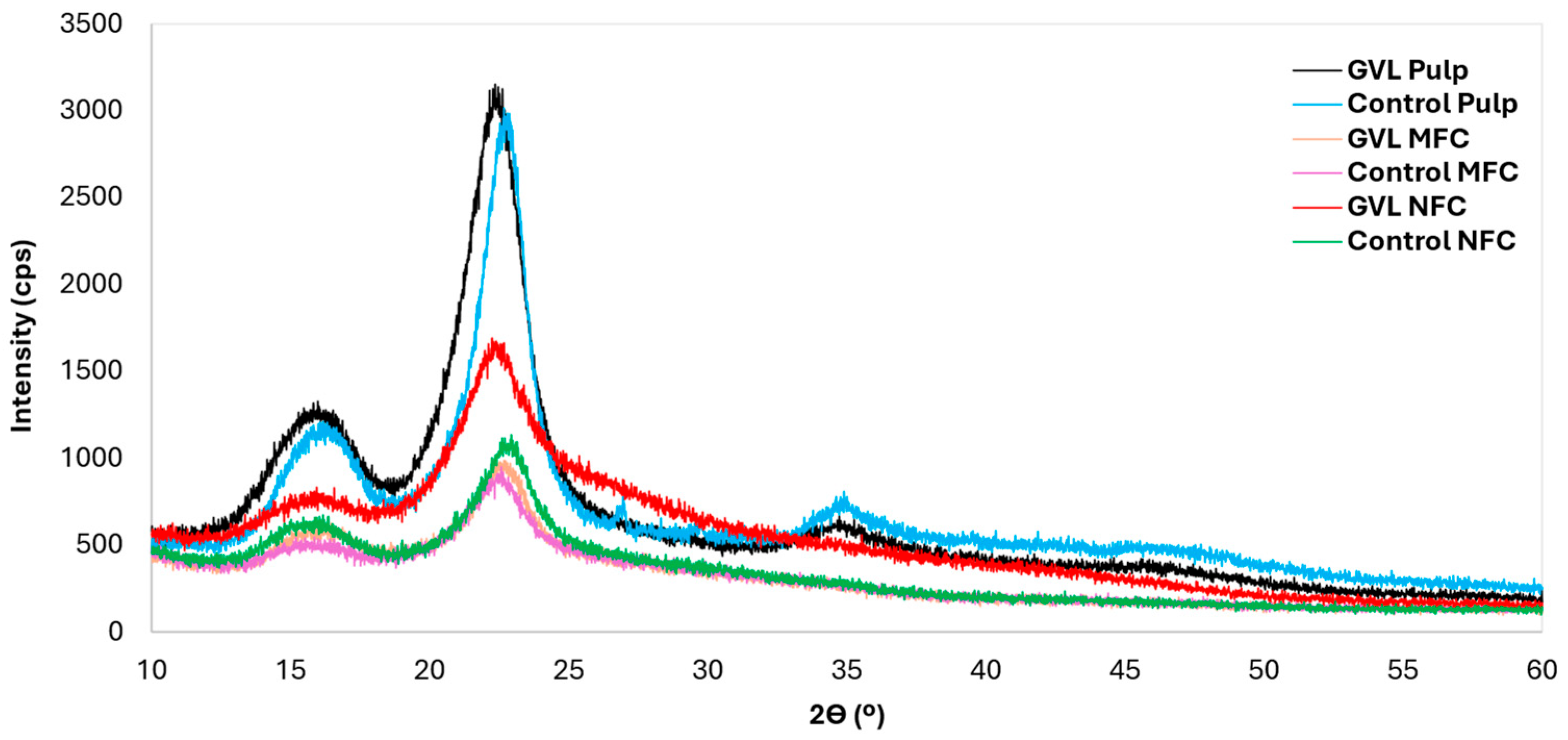 3.3. Surface Oxidation of GVL Fibers for NFC Production