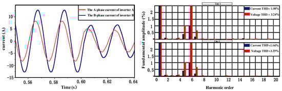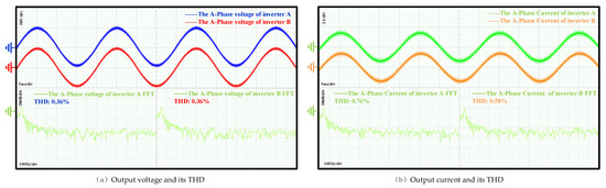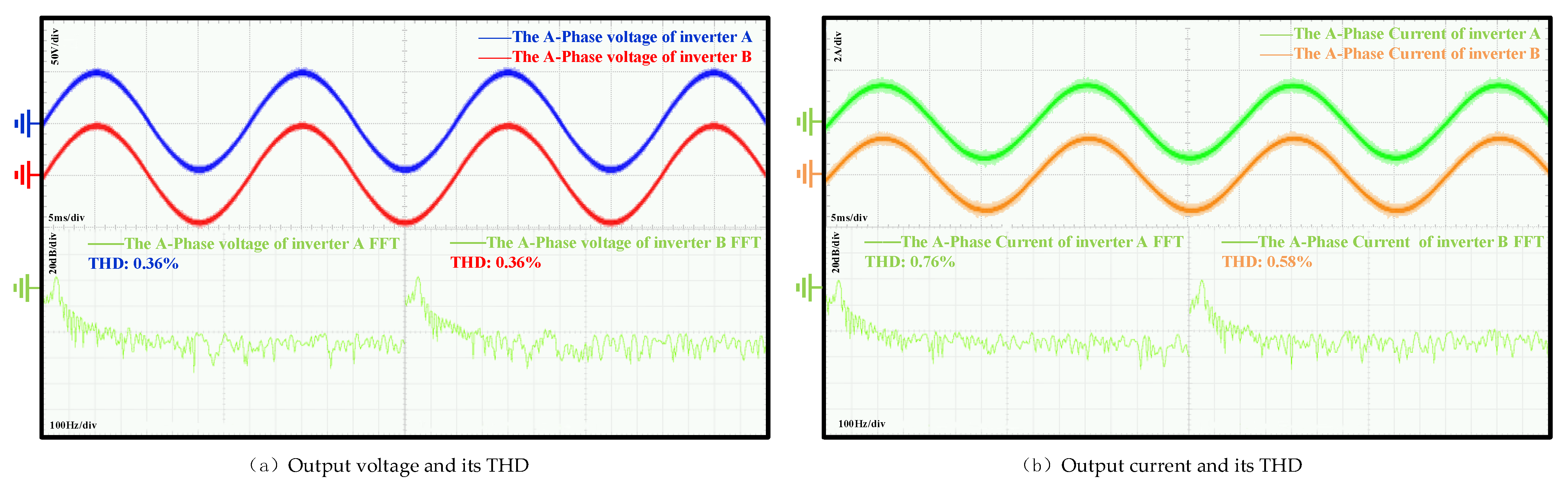 Figure 19 presents the output voltage, output current, and corresponding total harmonic distortion (THD) of the system under the improved droop control method at a switching frequency of 100 kHz. As shown in Figure 19a, the output voltages of inverters A and B exhibit closely matched phases and amplitudes, both maintaining approximately 50 V. Similarly, Figure 19b indicates that the output currents of the two inverters are also nearly identical in phase and magnitude, around 1.8 A. The consistency in both voltage and current waveforms demonstrates effective mitigation of current-sharing error and circulating current in the parallel inverter system. THD measurements show that the output voltage THD for both inverters is 0.36%, while the output current THD values are 0.76% for inverter 1 and 0.58% for inverter 2. Compared with the results in Figure 17, the output voltages, output currents, and THD values remain similar across different switching frequencies. This indicates that the improved droop control method maintains consistent performance in voltage and current balancing under high-switching-frequency conditions, effectively suppressing current imbalance and circulating current.