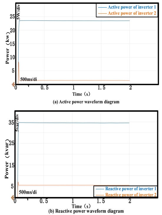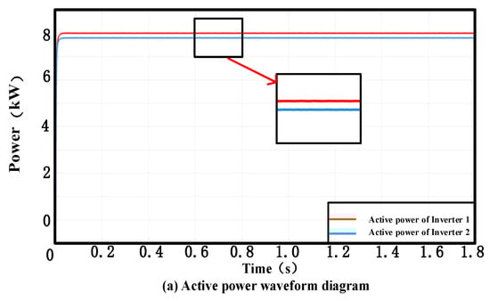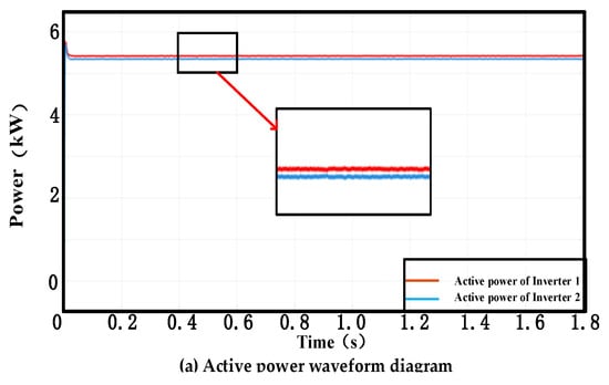 To validate the effectiveness of the proposed power-sharing and circulating current suppression methods, comprehensive simulations are conducted on the paralleled three-phase converter system. The simulation parameters are summarized in Table 4. The paralleled converters are configured with distinct line impedances to emulate near-end and far-end operating conditions. Transmission lines have parasitic parameters such as parasitic resistance. By connecting resistors of different resistance values in series on the line, that is, setting the impedance value of the remote line to six times that of the near line, the working conditions of the near and remote lines can be simulated. Converter 1 (distal position) is characterized by R1 = 0.642 Ω and L1 = 0.246 mH, while Converter 2 (proximal position) implements reduced impedance parameters scaled by a factor of 0.6 (R2 = 0.3852 Ω; L2 = 0.1476 mH).