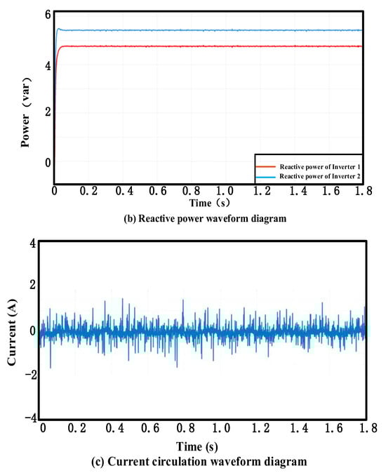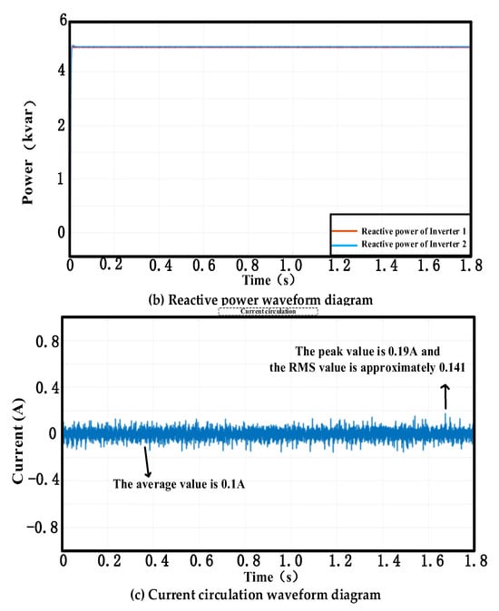 The MATLAB/Simulink simulation results at a switching frequency of 10 kHz, as shown in Figure 5, reveal distinct performance characteristics of the virtual impedance method: while active power sharing exhibits suboptimal equalization, reactive power achieves near-ideal distribution with fully overlapping reactive power trajectories. Concurrently, the virtual impedance demonstrates effective circulating current suppression, constraining the maximum circulating current amplitude to 0.2 A under rated operating conditions. The RMS value is equal to the peak value. The RMS value is approximately 0.141.