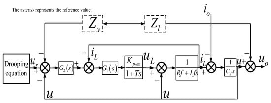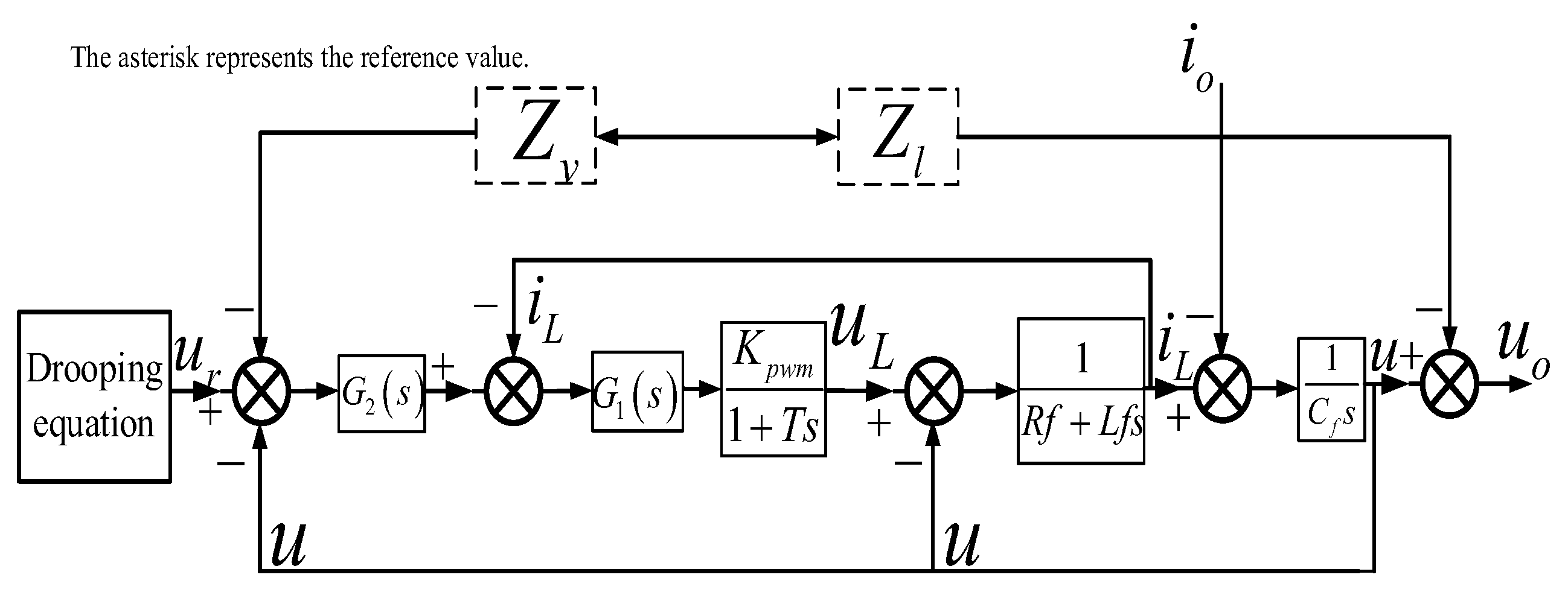 where , , , and , respectively, represent the converter output voltage, output current, reference voltage, and reference voltage gain coefficient, and , , and , respectively, represent the virtual impedance, output impedance, and line impedance, where .