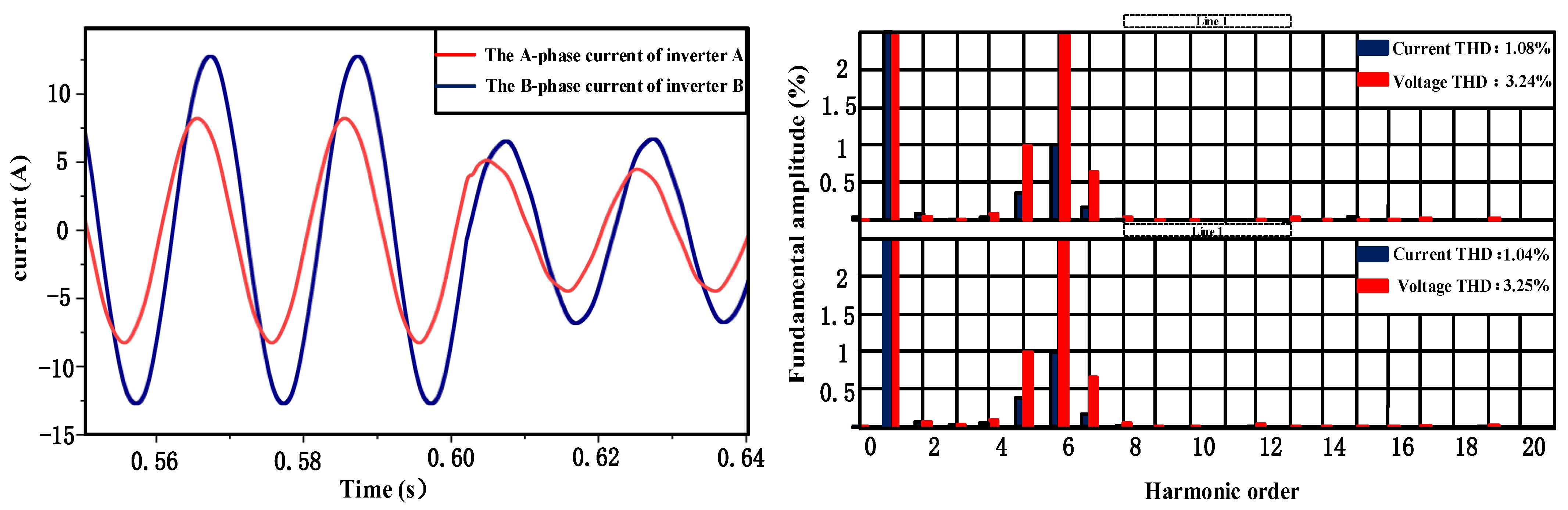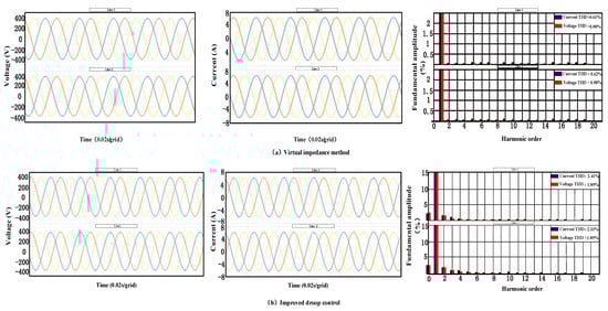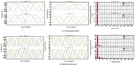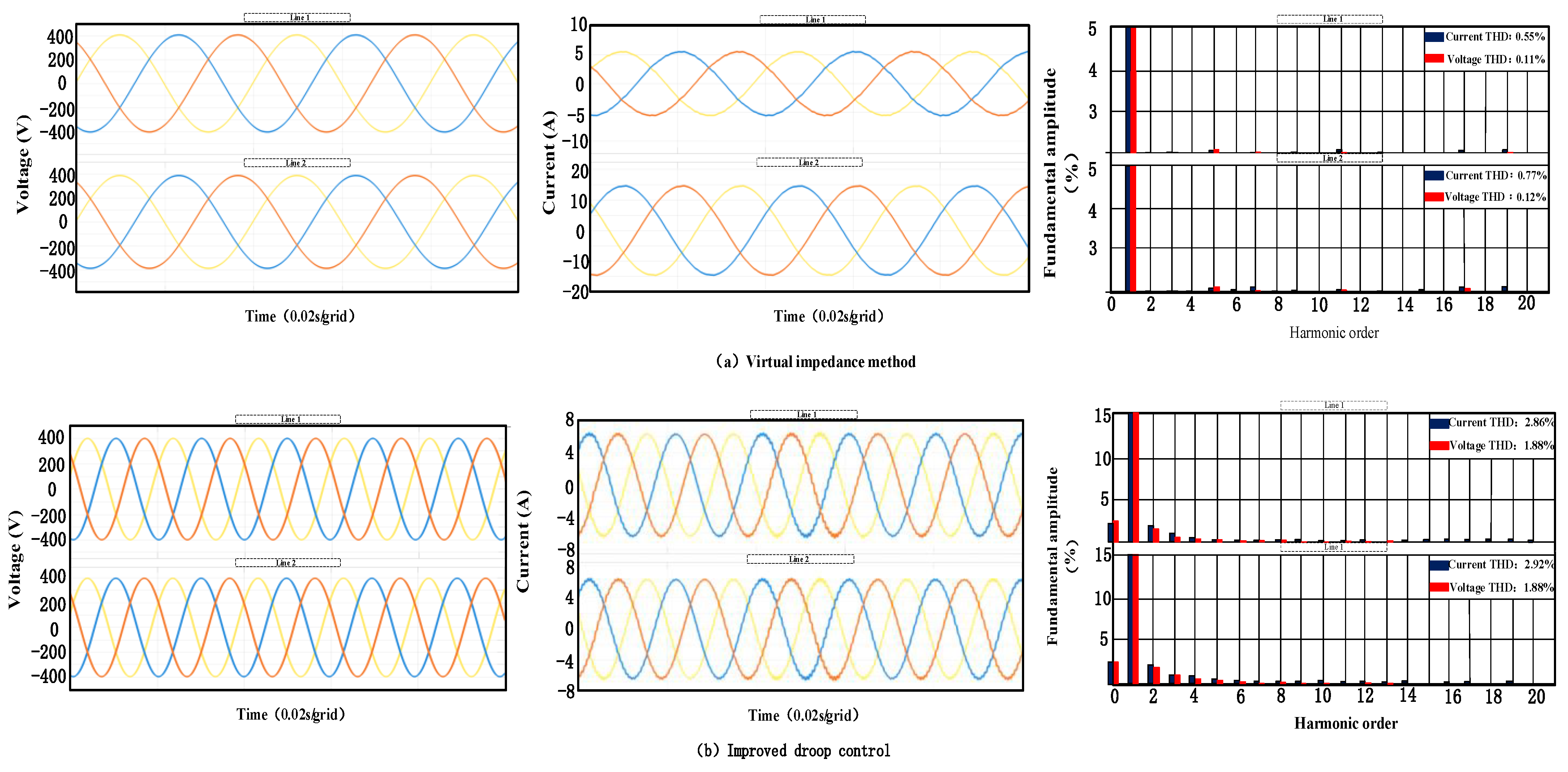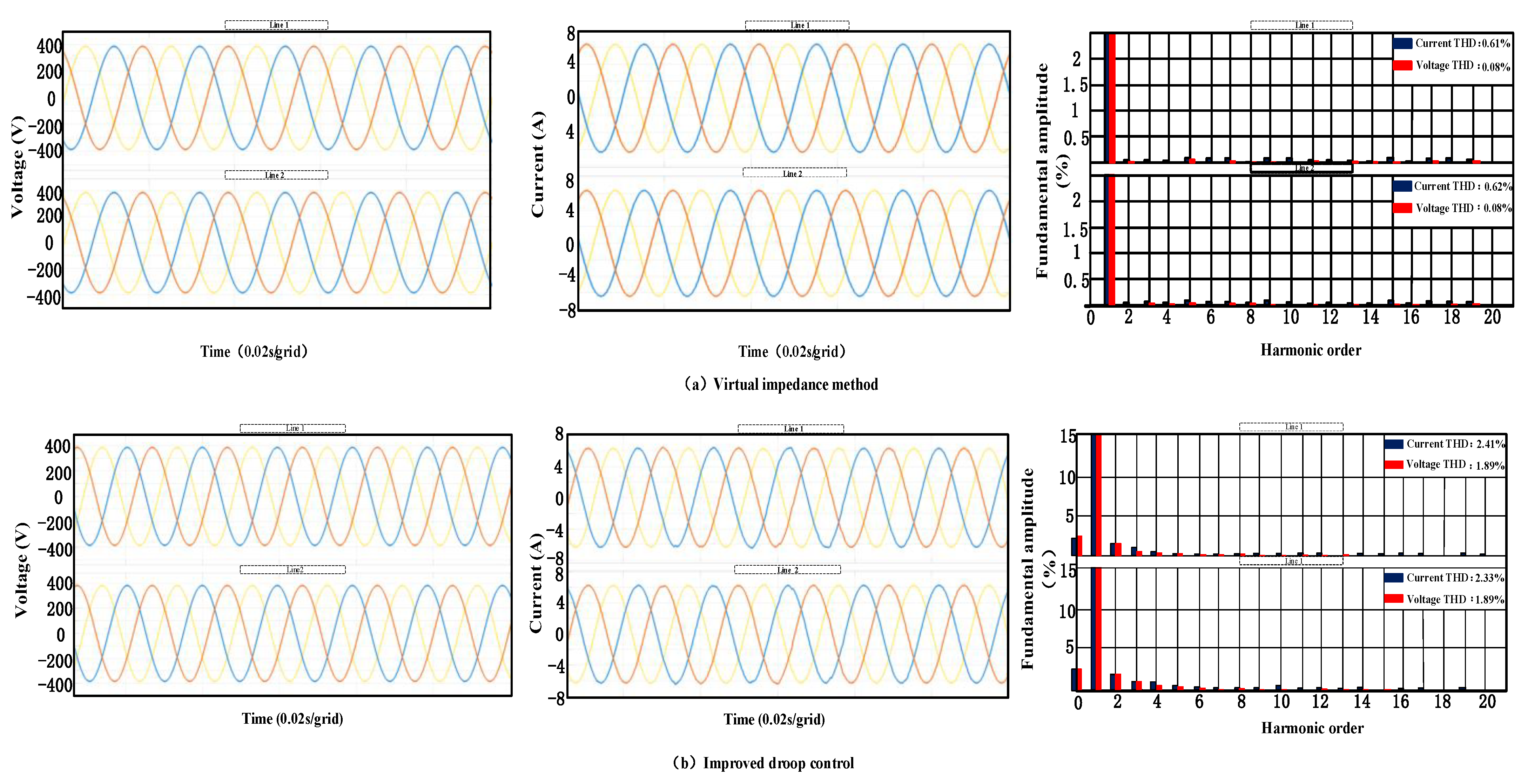 This section will compare the virtual impedance and the improved droop method voltage–current THD under different switching frequencies, as well as the power and circulating current of the droop control method and the improved droop method. In terms of power and circulating current, the control effect of the improved droop method is better than that of the droop control method, and at the same time, the control effect of the improved droop method can also achieve the control effect of the virtual impedance control.