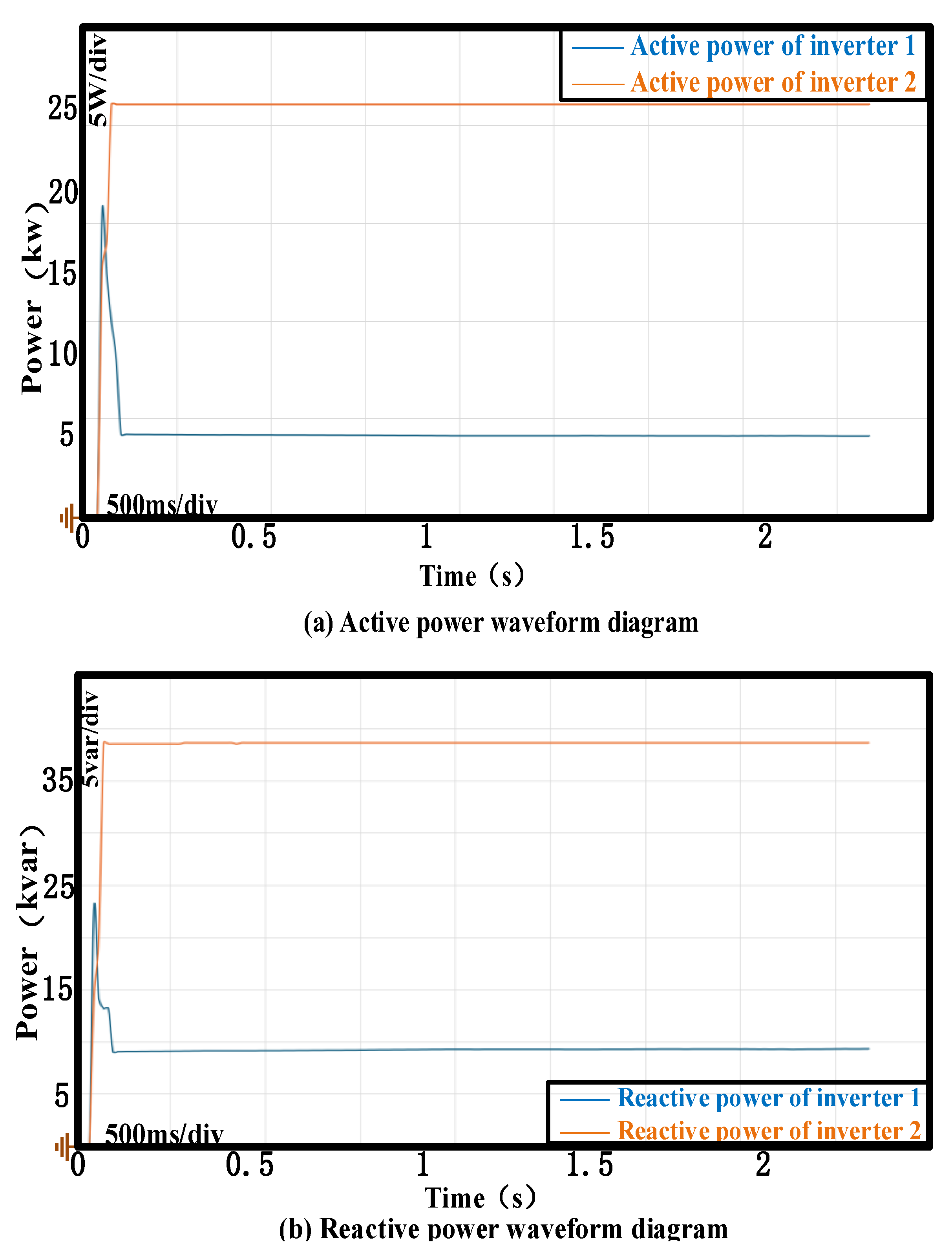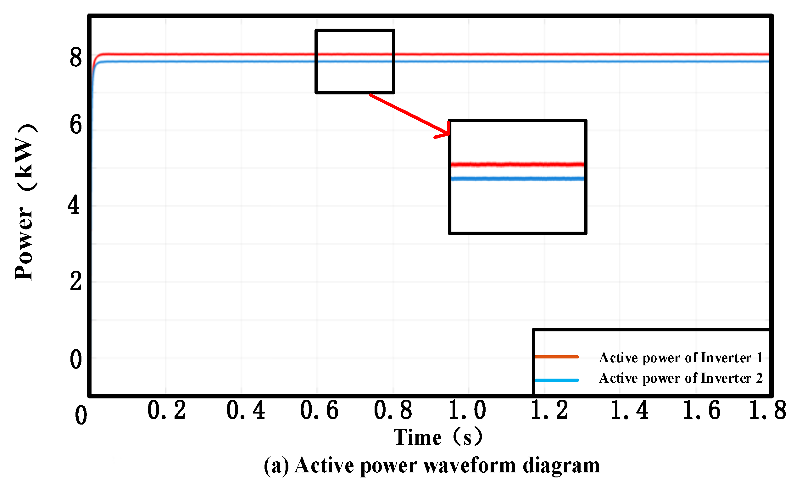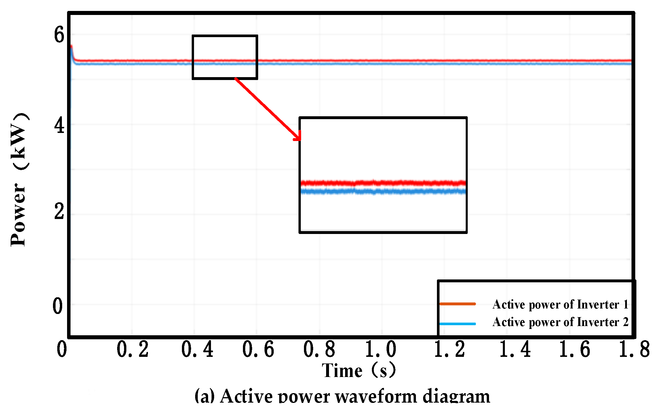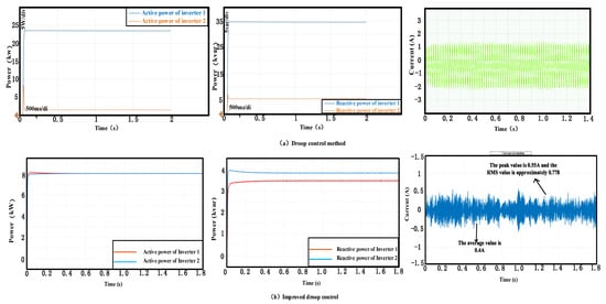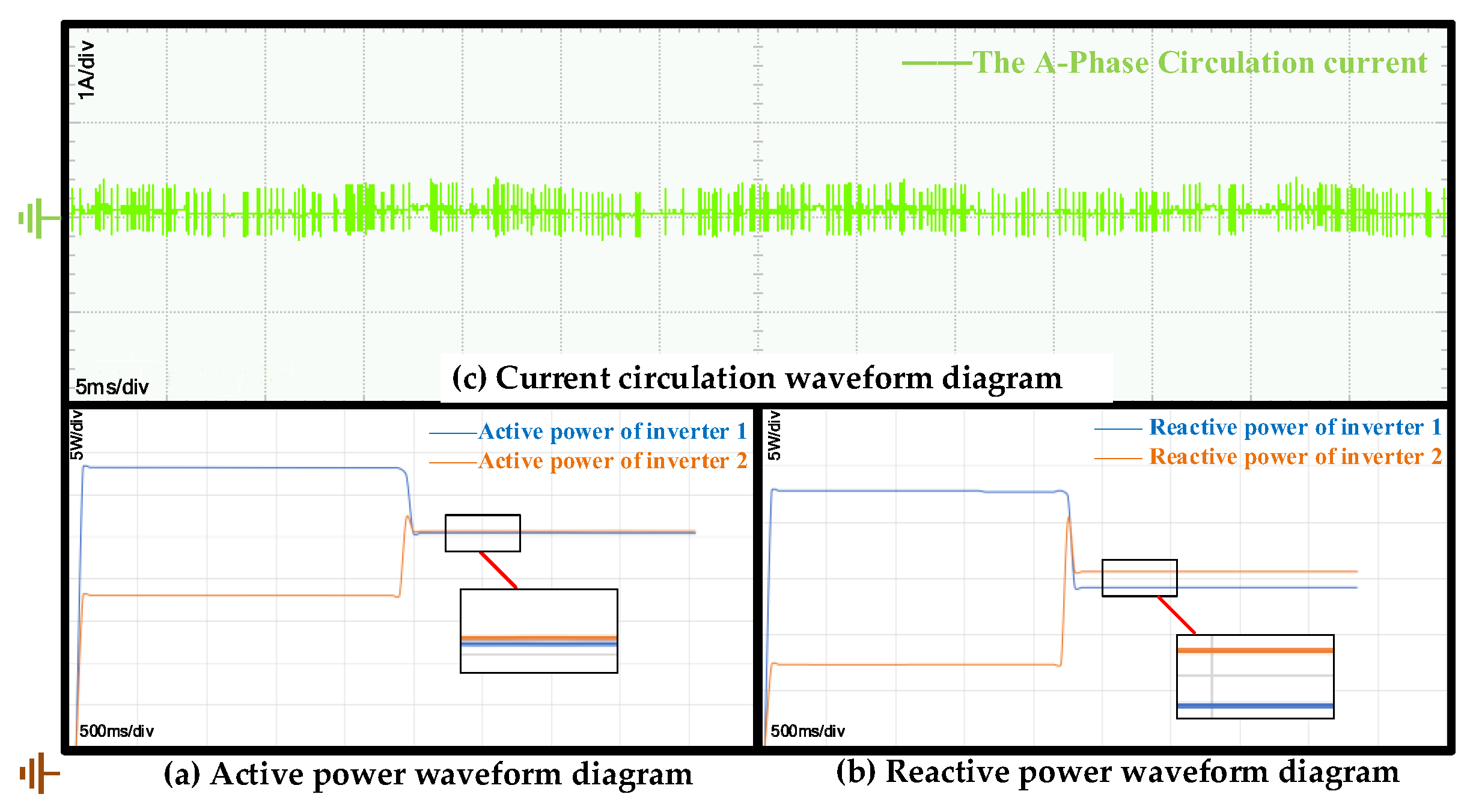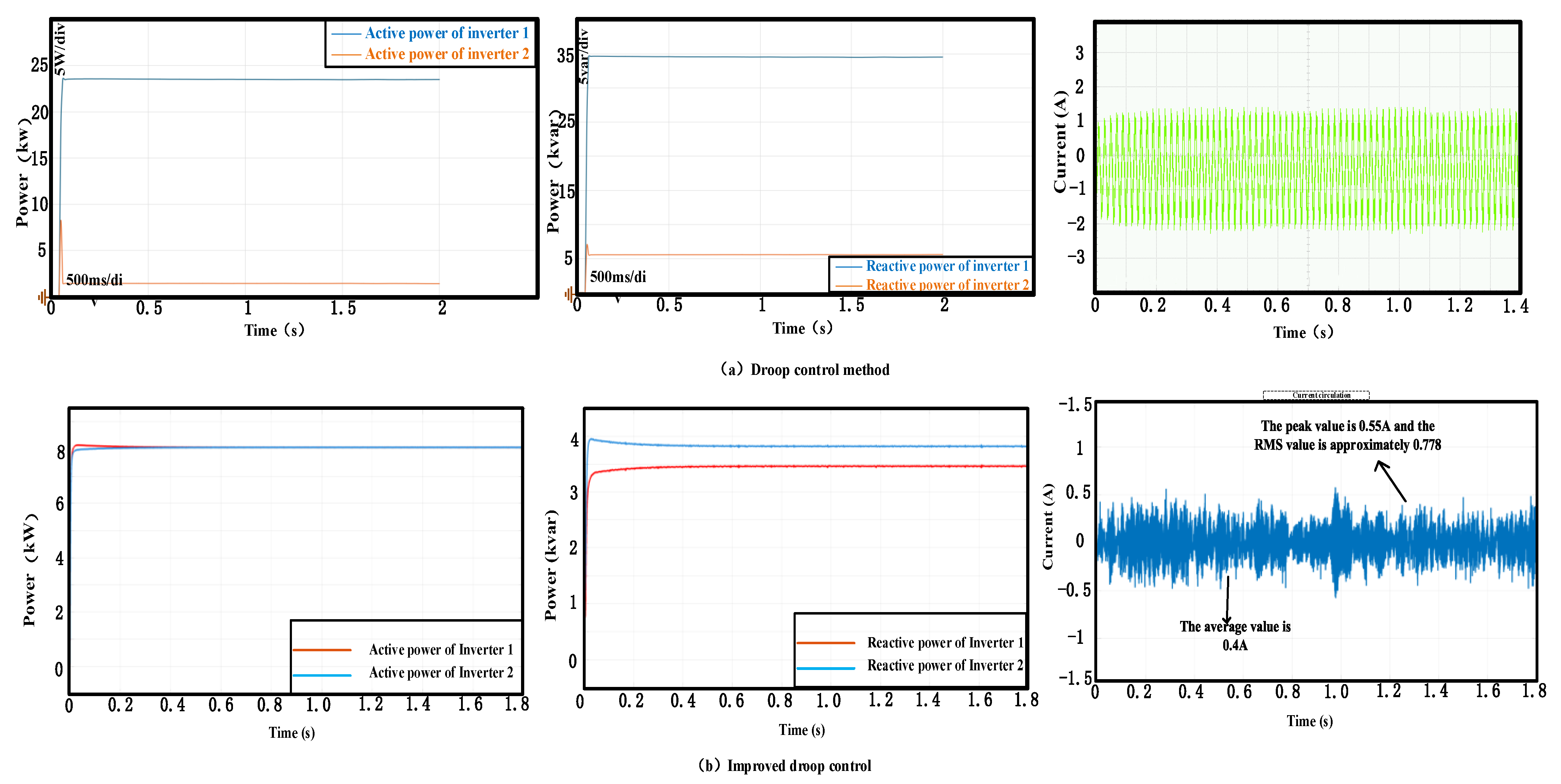 Figure 15 illustrates active power sharing, reactive power sharing, and circulating currents of parallel-connected inverters under control methods. Figure 15a shows the power-sharing performance and cyclic current waveform under the droop control method, and in the droop control, a switch conversion function has been added. However, at the very beginning, there was a slight overcharge phenomenon, and there was a difference in the power distribution of reactive power. Inverter 1 output 19 kW, while inverter 2 output 18 kW. In contrast, Figure 15b presents an improved droop control implementation, achieving synchronous power sharing with a steady-state error of less than 2%. The comparative analysis shows that compared with the traditional droop control, the active power-sharing error of this method is reduced by 4%, and the reactive power balance accuracy is improved by 15.4%. The cyclic current was still limited to ±0.4 A (average) and 0.7 A (peak), and the RMS value is approximately 0.5, representing an 85% suppression compared with the baseline descent method. It is worth noting that this improved method solves the active power-sharing defect observed in the virtual impedance method while eliminating the communication dependence.