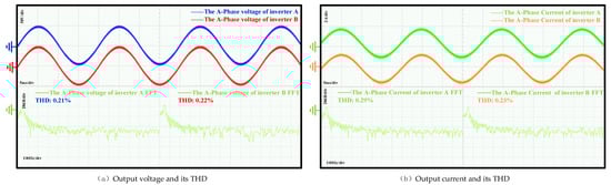 Experimental results of the equal distribution of output voltage, output current, and THD between two inverters using the improved droop control method at 10 kHz. (a) Output voltage and its THD. (b) Output current and its THD.