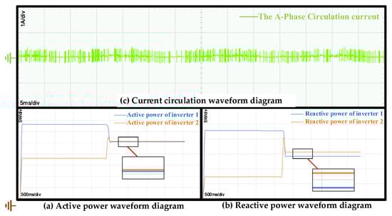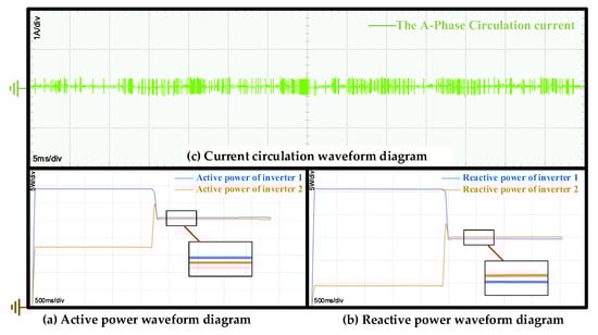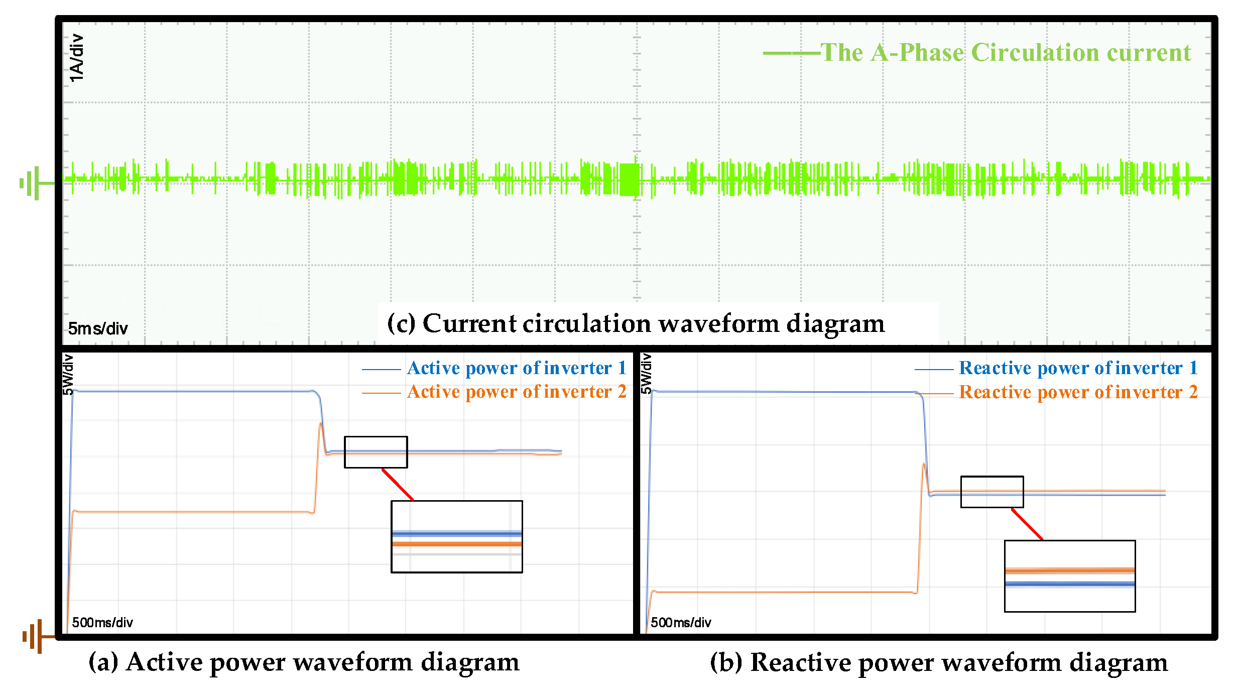 The switching frequency is 100 kHz, and the parallel output of the inverter is realized by using the droop control method. (a) Active power waveform diagram of the inverter 1, 2. (b) Reactive power waveform diagram of the inverter 1, 2. (c) Current circulation waveform diagram of the inverter.