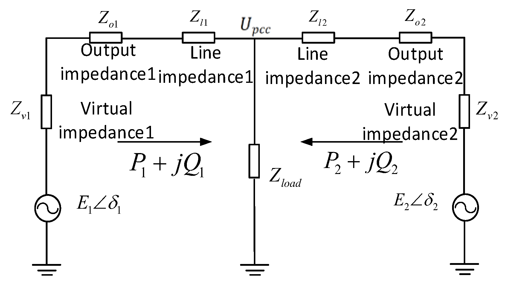 In practical implementations, fixed system impedance cannot be arbitrarily adjusted, and impedance mismatches must be compensated through control-oriented solutions, necessitating the employment of virtual impedance techniques. The equivalent circuit after introducing virtual impedance to the two parallel inverters, where the virtual impedance, output impedance, and line impedance of the two can be expressed, is shown in Figure 3.