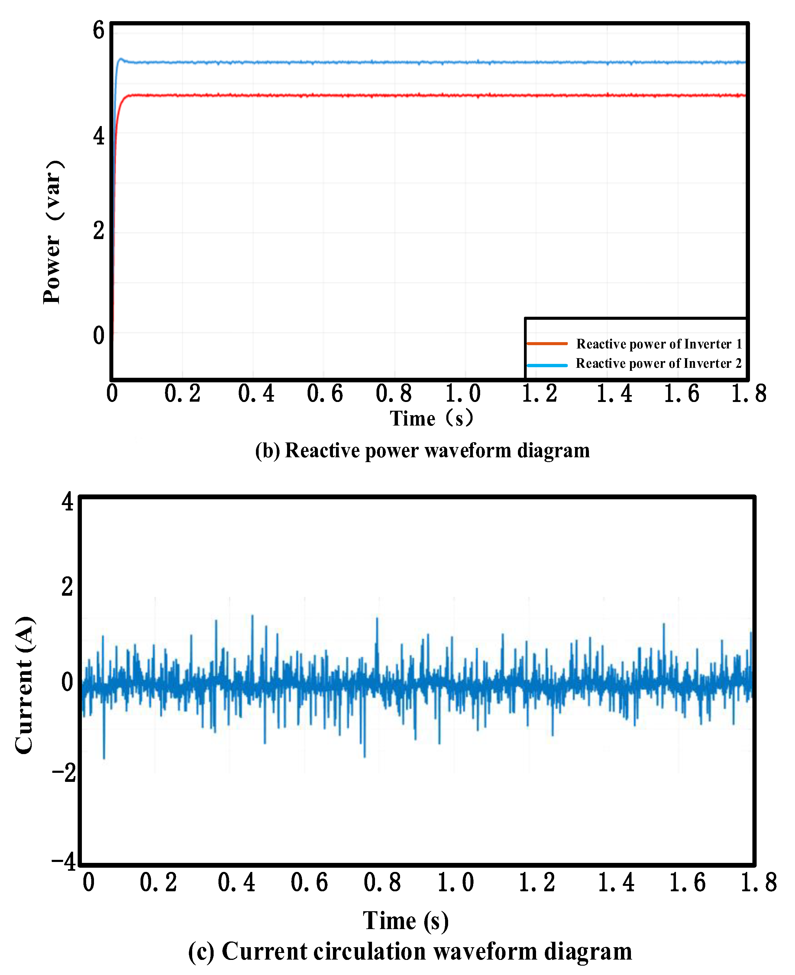 The switching frequency is 10 kHz, and the parallel output of the inverter is realized by using the droop control method. (a) Active power waveform diagram of the inverter 1, 2. (b) Reactive power waveform diagram of the inverter 1, 2. (c) Current circulation waveform diagram of the inverter.