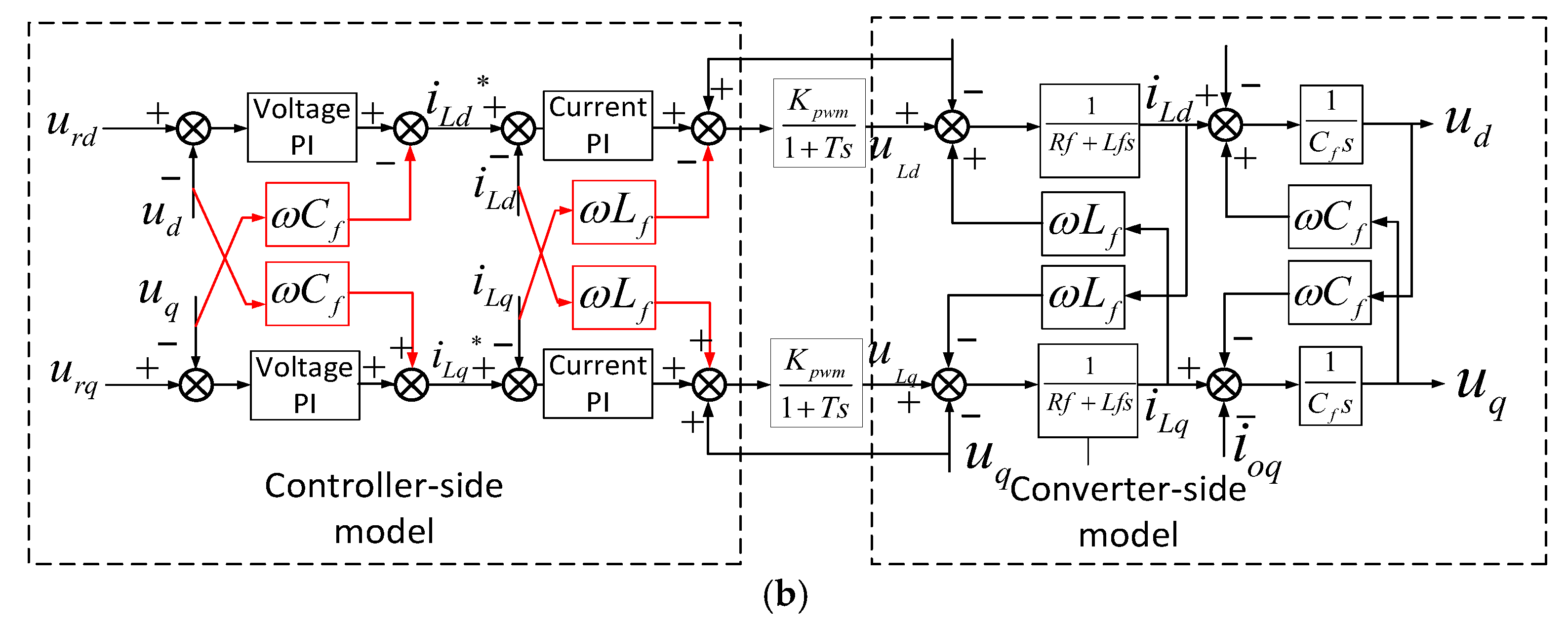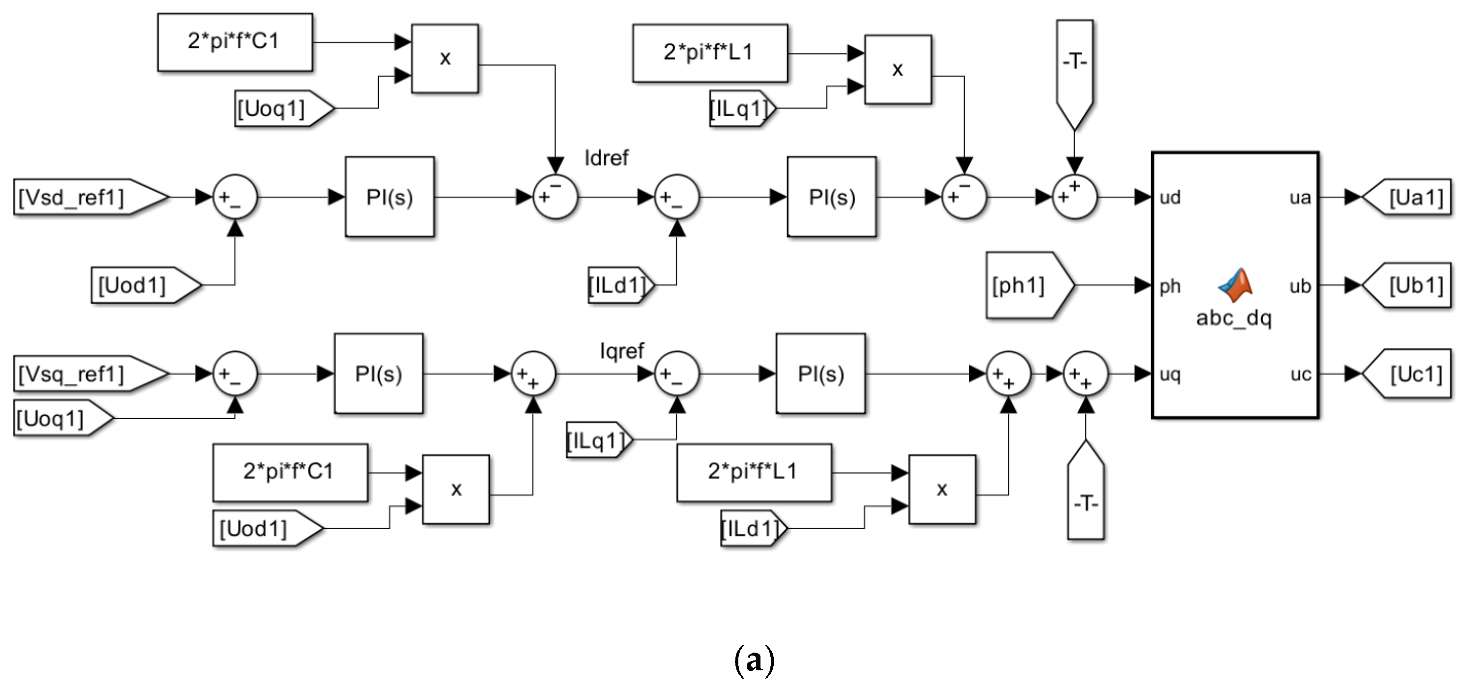 This paper presents an improved droop control strategy, which addresses the power distribution imbalance problem caused by communication delay in the droop method. The control system of the improved droop necessitates systematic decoupling of cross-coupled terms inherent in the inverter topology. As shown in Figure 9a, the MATLAB simulation models the outer voltage loop and the inner current loop. The voltage loop and the current loop, respectively, use PI controllers, and then the PWM control signal is obtained through transformation. As shown in Figure 9b, a dual-loop control architecture is implemented, where decoupling compensation terms are integrated into both the capacitor voltage feedback loop and inductor current feedback loop. The -axis capacitor voltages are regulated via PI controller , with reference values generated from the droop equation. The compensated voltage output combines the PI-regulated signal and decoupling terms to establish the inductor current references. The dq-axis inductor currents are tracked by PI controller . The resultant modulated waveform integrates both current feedback and dynamic decoupling compensation.