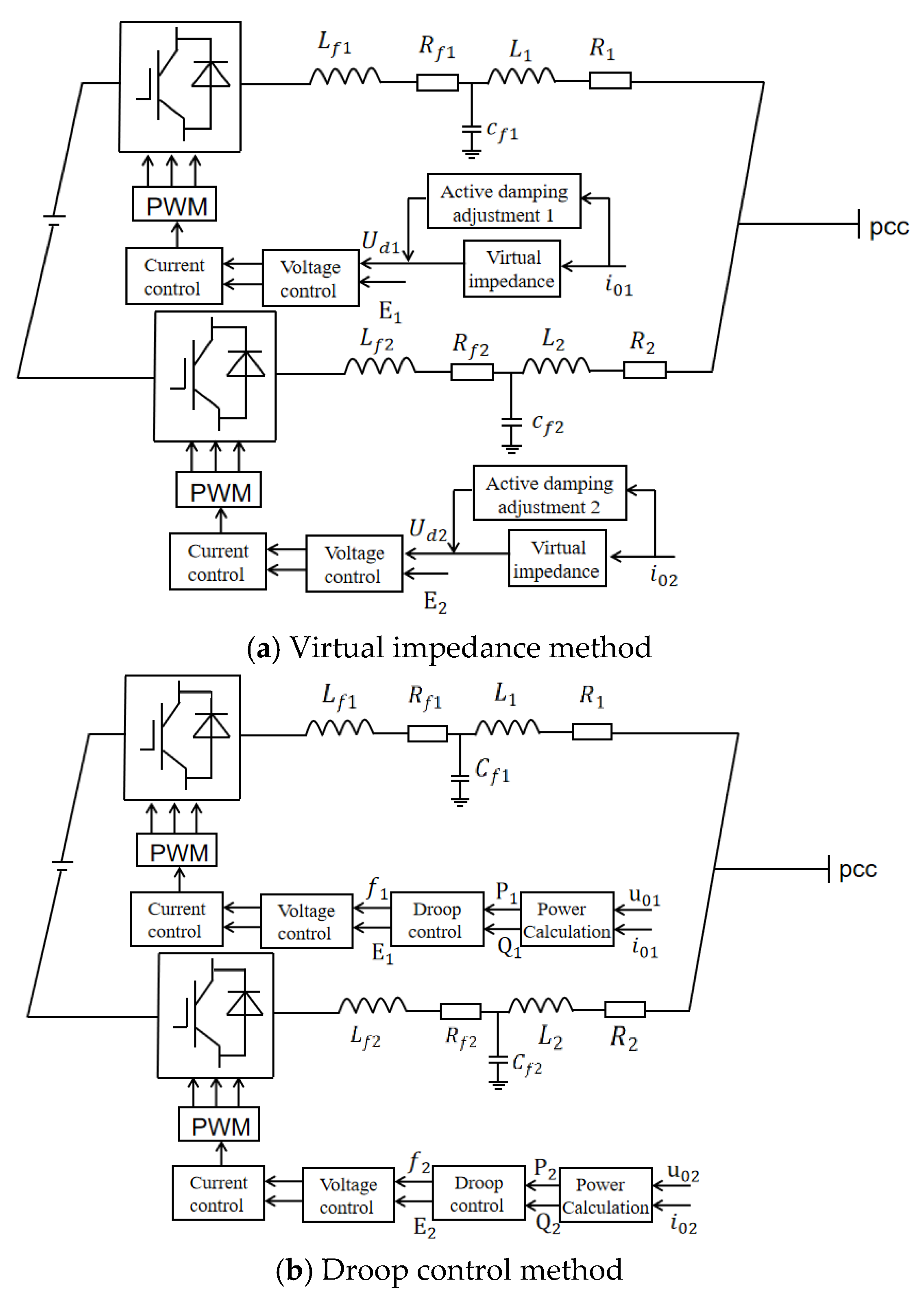 In addition, the droop control method is also commonly used for parallel connection of inverters [19]. An adaptive droop coefficient adjustment method has been proposed to solve the contradiction between power distribution accuracy and dynamic response in traditional methods [20,21]. Improved droop also has been proposed, which can control the power-sharing error within 1.5% [22]. By analyzing the equivalent model of the parallel system, researchers used dynamic feedforward compensation technology to handle nonlinear load disturbances, and experiments showed that THD can be reduced to less than 2% [23]. In addition, by optimizing the droop coefficient and implementing parallel current-sharing control, distributed self-regulation of current balance is achieved [24]. By improving the power droop control strategy of the inverter, a higher power distribution accuracy and good dynamic response capability between parallel inverters were achieved, and the cyclic current between parallel inverters was suppressed, which was mentioned in [25]. The improved droop control method introduces virtual resistance and resistance in the equivalent output impedance of the inverter, making it a purely inductive load. However, the influence of excessive resistance on the system power and voltage drop was ignored, and at the same time, the influence of nonlinear loads on the harmonic stability of the system could not be eliminated. The problem of voltage distortion and unreasonable power distribution between parallel inverters caused by harmonic current passing through virtual resistance was mentioned in [26]. The vertical control strategy enables each distributed power source to effectively eliminate the voltage drop on the AC bus and restore the bus voltage to the rated value while achieving precise reactive power distribution, as proposed in [27].