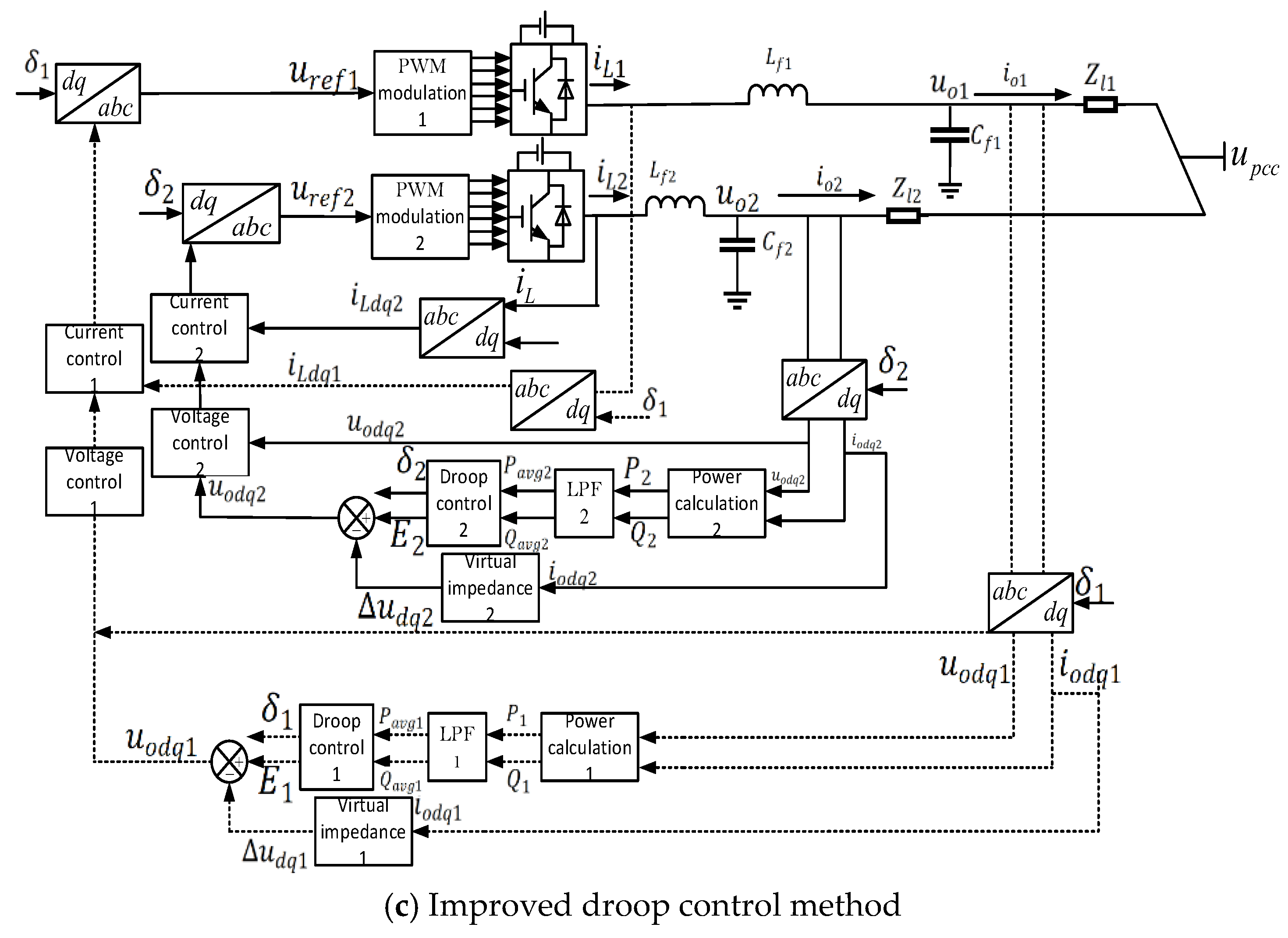The virtual impedance method introduces a virtual impedance loop to reshape the equivalent output impedance, as shown in Figure 12a, thereby suppressing circulating currents and improving power-sharing accuracy, though at the potential cost of voltage regulation performance. Droop control mimics synchronous generator behavior by employing and droop curves to enable communication-free power sharing, as shown in Figure 12b. However, its performance degrades in networks with mismatched line impedances, leading to power-sharing errors. The improved droop method incorporates an active damping adjustment module to dynamically adapt droop coefficients or virtual impedance parameters, effectively suppressing power oscillations and enhancing system damping for better transient response and steady-state accuracy. The system block diagram of the inverter with the improved droop control method is shown in Figure 12c. Among these methods, virtual impedance focuses on impedance reshaping, and droop control relies on static droop characteristics, while the improved method achieves superior robustness through dynamic damping compensation. Their block diagram distinctions primarily lie in the complexity of feedback loops and the integration of damping compensation mechanisms.