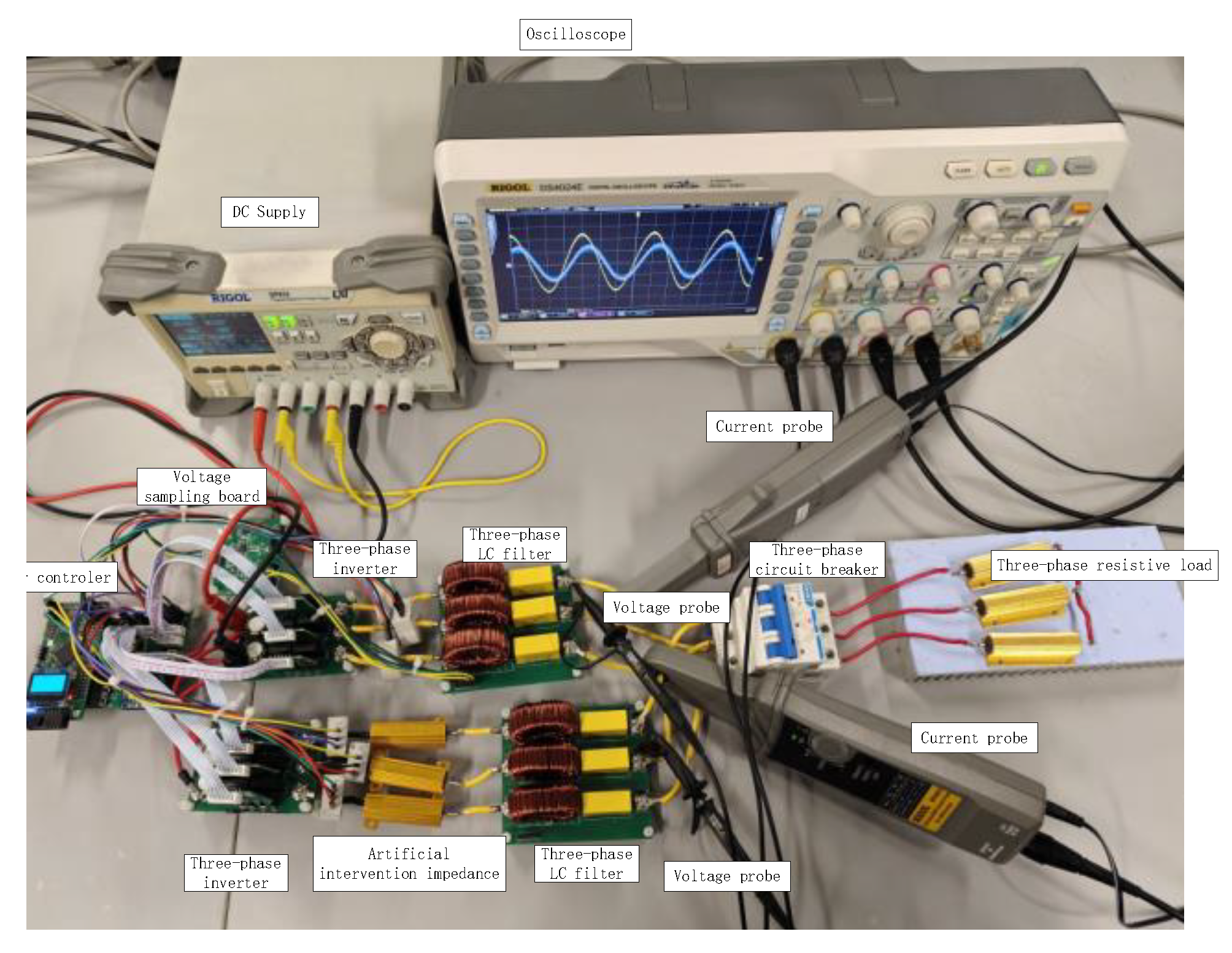 At the baseline, the voltage THD is around 3%, and the current THD is around 1%. The switching frequency is 10 kHz. The virtual impedance voltage THD is 0.08%, the current THD does not exceed 0.62%, and the RMS value is 0.141. At a switching frequency of 100 kHz, the droop control voltage THD is 0.11%/0.12%, and the current THD does not exceed 0.77%. With the improved droop control, at different switching frequencies, the voltage THDs are all within 2%, the current THD is within 3%, and the RMS values are 0.5 and 1.06, respectively. Experimental validation under hardware conditions further confirms the effectiveness of the proposed method. The results indicate that the circulating current is effectively suppressed within 0.4 A at 10 kHz and 0.6 A at 100 kHz switching frequencies. Both active and reactive power outputs converge rapidly and stabilize with high precision, achieving nearly equal power sharing between the two inverters after transient adjustments. Moreover, output voltage and current waveforms remain well synchronized in both phase and amplitude under different switching conditions, with output voltage THD maintained below 0.36% and current THD below 0.76%.