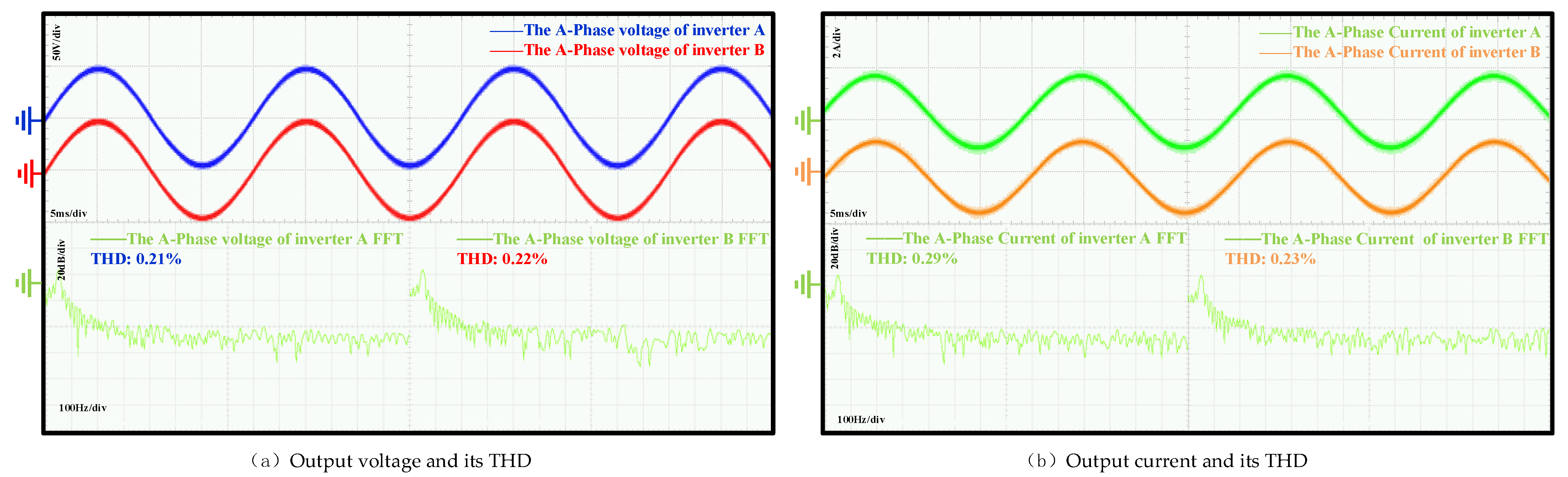 Experimental results on the equal distribution of output voltage, output current, and THD between two inverters using the improved droop control method at 100 kHz. (a) Output voltage and its THD. (b) Output current and its THD.