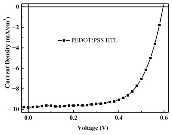 J–V characteristic curves of polymer solar cell fabricated with PEDOT:PSS as hole transport layer.