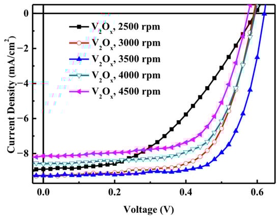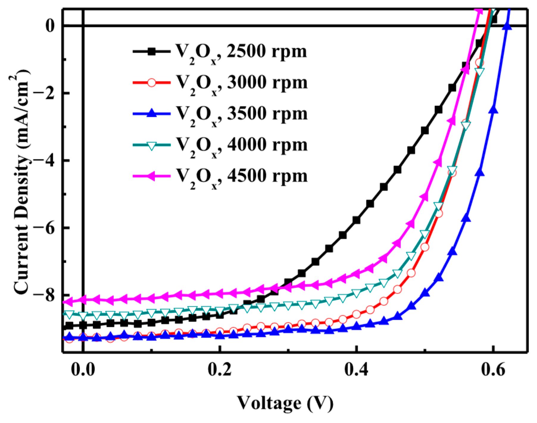 Next, we assesses the V2Ox device structure obtained when adjusting the spin-coating rotation speed as the speed determines the thickness of the material [28]. Figure 3 shows the J–V characteristics of polymer solar cells with a V2Ox hole transport layers fabricated at different rotation speeds. When the rotation speed was too low, the V2Ox was found to be too thick. After the active layer was illuminated, the separated holes could not be easily conducted to the anode.