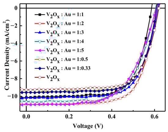 Characteristic curves of polymer solar cells made using V2Ox and 80 nm Au-NP aqueous solution mixtures with different volume ratios.