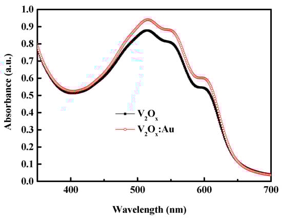 Absorbance spectra of P3HT:PCBM blended film with different hole transport layers; namely V2Ox and V2Ox:Au.
