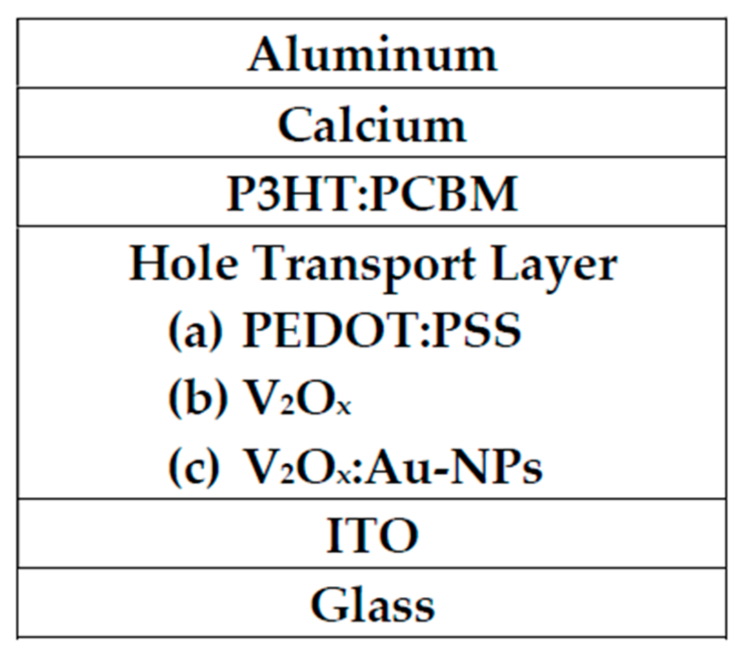 The architecture of this device presented in this study is mainly divided into three parts. Starting from the indium-tin-oxide (ITO)-coated glass, its structure from bottom to top was a hole transport layer (50 nm), a P3HT:PCBM active layer (200 ± 10 nm), and calcium (20 nm), and aluminum (100 nm). ITO was used as the transparent conducting anode while aluminum was used as the cathode due to its low work function. Figure 1 shows the structure of a polymer solar cell using PEDOT:PSS, V2Ox, or V2Ox:Au-NPs as the hole transport layer.