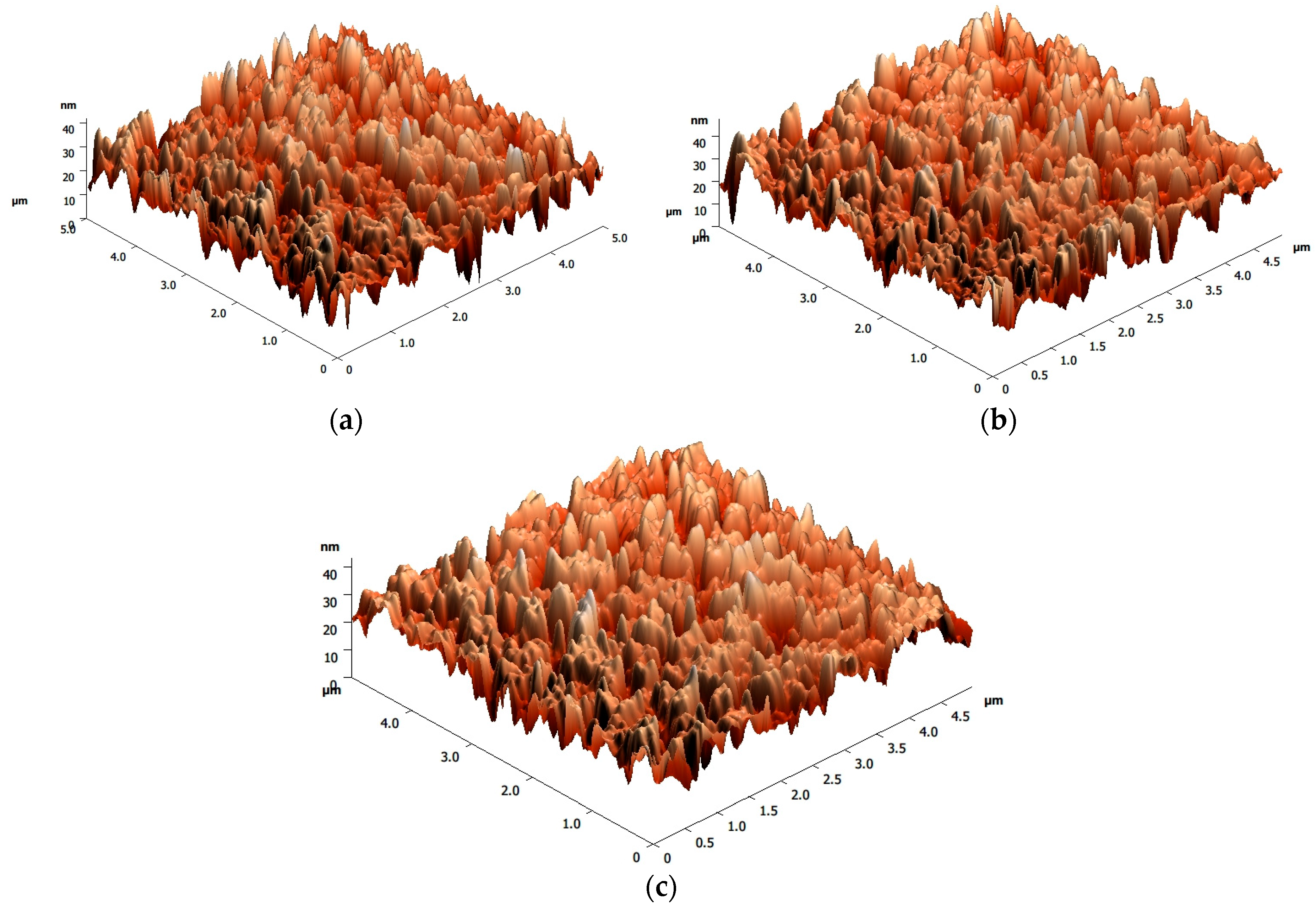 Figure 5 shows the AFM images of V2Ox annealed at different temperatures (i.e., 100, 140, and 180 °C). It can be clearly seen that when the annealing temperature increased from 100 to 140 °C, the root-means-square (rms) roughness of the surface increased from 5.17 nm to 5.75 nm, effectively decreasing the distance of hole transmission. Therefore, the electron hole recombination rate can be reduced and the photocurrent can be increased, thus improving the efficiency [29]. However, when the annealing temperature decreased from 140 °C to 180 °C, due to the increase in annealing temperature, the rms roughness decreases from 5.75 nm to 5.12 nm (as shown in Figure 5), thus decreasing JSC.