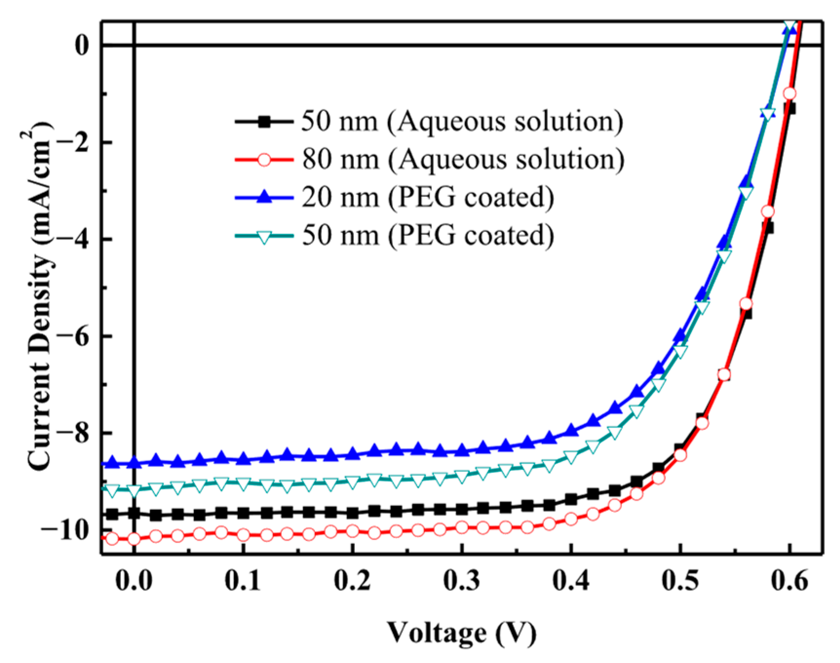 To study the effects of incorporating Au-NPs into V2Ox, V2Ox and Au-NPs of different sizes and sources were mixed in a 1:1 volume ratio. After shaking evenly using an oscillator, they were then applied to the cleaned ITO glass substrate via spin coating, then developed into solar cell materials. Figure 6 depicts the J–V characteristics of solar cells obtained by mixing V2Ox with Au-NPs of different sizes and sources, and Table 3 lists the relevant parameters. Compared with solar cells made with PEG-coated Au-NPs, those made with aqueous Au-NPs exhibited higher VOC, FF, and PCE values. The solar cells made with an aqueous solution of 80 nm Au-NPs exhibited the highest PCE.