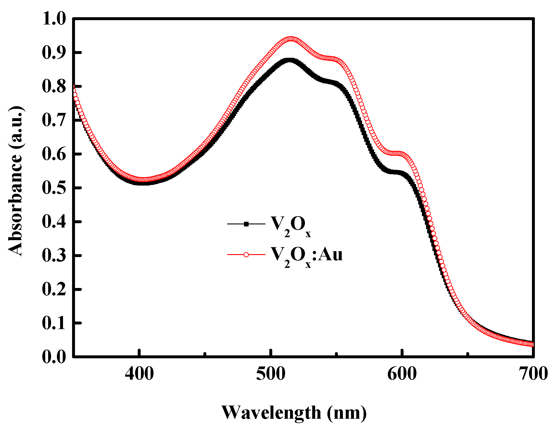 When a light source is incident on an ITO glass substrate with an ITO/V2Ox:Au-NPs/P3HT:PCBM structure, two possible mechanisms can affect the absorption efficiency of the active layer [11] the light scattering effect and the light LSPR effect. Generally speaking, the scattering efficiency of Au-NPs only exceeds their absorption efficiency when the particle size is greater than 100 nm. As the average size of Au-NPs was less than 100 nm in our experiment. It can be considered that the absorption efficiency was primarily driven by the LSPR effect; namely the LSPR effect induced by the addition of the considered Au-NPs enhances light collection in the active region.