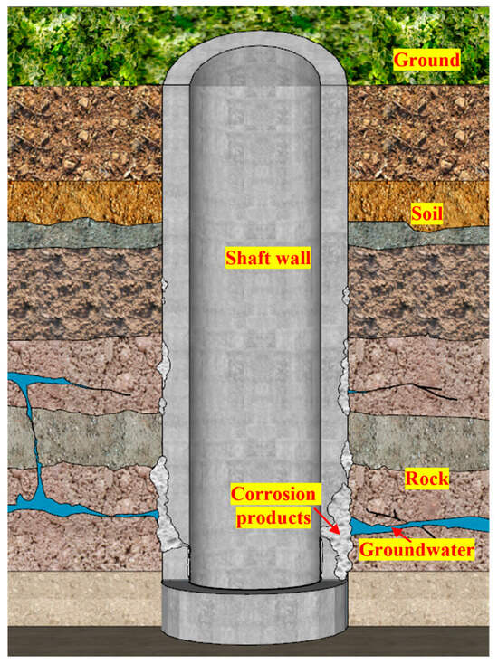The vertical shaft serves as the primary conduit for coal mining in underground mines, providing a critical link between the surface and the underground mining areas [1,2]. The structural stability of the shaft wall determines the safety of the whole shaft. Inner Mongolia and Henan Province are two of China’s major coal-producing regions, where several vertical shafts are in service and where the shafts pass through stratigraphic environments characterized by groundwater-rich sandstone formations. Due to these special geological conditions, conventional shaft wall designs primarily consider three factors: hydrostatic pressure, vertical additional force, and temperature stress. However, the groundwater contained in the deep sandstone formations in these mining regions contains corrosive ions, such as sulfate ions (SO42−), which can induce corrosion and damage to the vertical shaft walls. Furthermore, the shaft walls are constantly subjected to hydrostatic pressure during the long-term service of the shaft wall. A series of chemical reactions will be initiated when the corrosive ions, transported by the groundwater, penetrate the concrete shaft wall and cause corrosion damage to the concrete shaft wall. Consequently, the strength and durability of the shaft wall concrete will be reduced, which may cause groundwater damage and submerge the shaft, threatening the production safety of the staff and potentially endangering nearby communities [3]. Since 1987, hundreds of shaft wall failures have occurred in Northwest and Central China, resulting in substantial economic losses [4].