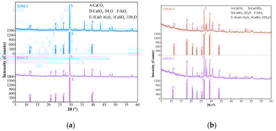 Figure 8. (a) The XRD patterns of loose substances in the north and west of shaft lining; (b) the XRD patterns of some concrete core samples.