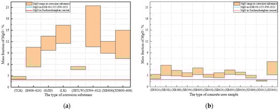 It can be observed from Figure 13a that the MgO content (compared with the composition analysis standard of Xuzhou Zhonglian P·O 42.5 cement) of the concrete shedding block and the loose materials on the inner surface of the shaft wall from Shunhe Coal Mine exceeds the standard value by 11.08 times. Based on the corrosion mechanism of concrete by water, it can be seen that MgSO4 erosion is one of the most aggressive sulfates, as shown in Figure 12a and Figure 13a. The reason is that MgSO4 erosion is a double erosion of Mg2+ and SO42−, and the two ions are superimposed on the shaft wall to form a serious composite erosion.