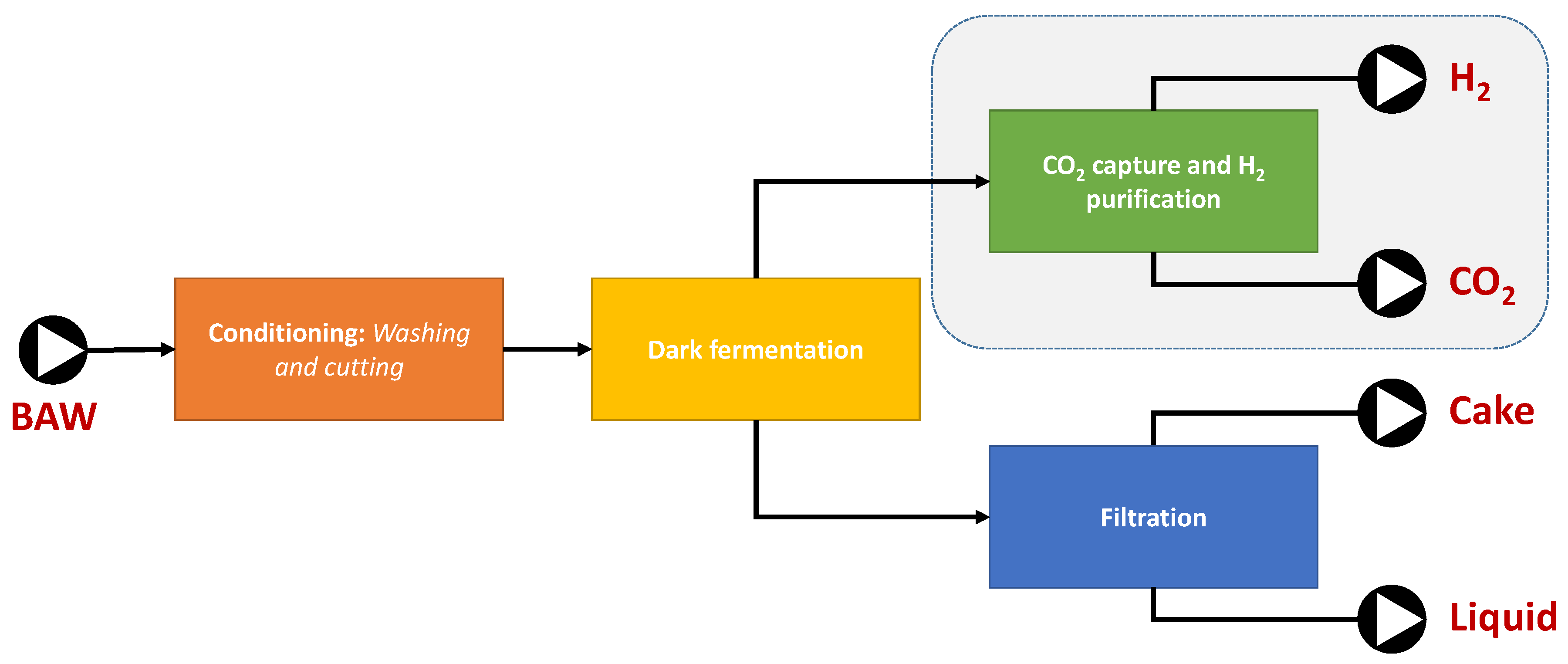 - Ganguly, A.; Sun, P.; Liu, X.; Delgado, H.E.; Sun, L.; Elgowainy, A. Techno-economic and life cycle analysis of bio-hydrogen production using bio-based waste streams through the integration of dark fermentation and microbial electrolysis. Green Chem. 2025, 27, 6213–6231. [Google Scholar] [CrossRef]
