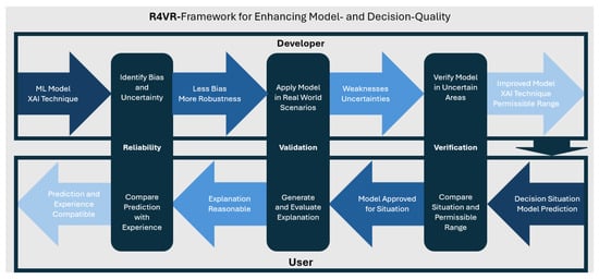 Based on these three mechanisms, we proposed the R4VR-framework—a two-layered framework including the developer as well as the end user of a model. The first layer of the framework addresses the development phase. Here, we suggested that the developer of a model should first of all increase reliability of the model by using XAI. In particular, the developer should harness XAI to reduce bias and increase robustness of the model. In the next step, the model is validated using a human-in-the-loop (HiL) approach. To that end, the model is applied in real-world scenarios with a human expert in the loop. During application, XAI as well as UQ are used in order to allow the human expert to better assess the model. That way, weaknesses of the model can be identified and then be addressed by the developer. Finally, the developer verifies the model, meaning that they examine the model behavior for certain input ranges. Based on the examination and the data the model was trained on, they specify a range in which the model can be applied.