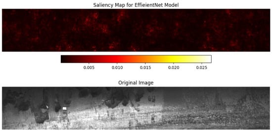 Example of saliency map (upper plot) and corresponding image (lower plot). The most important regions used for classification are marked in lighter red; important regions correspond to the areas in the image where defect is located.